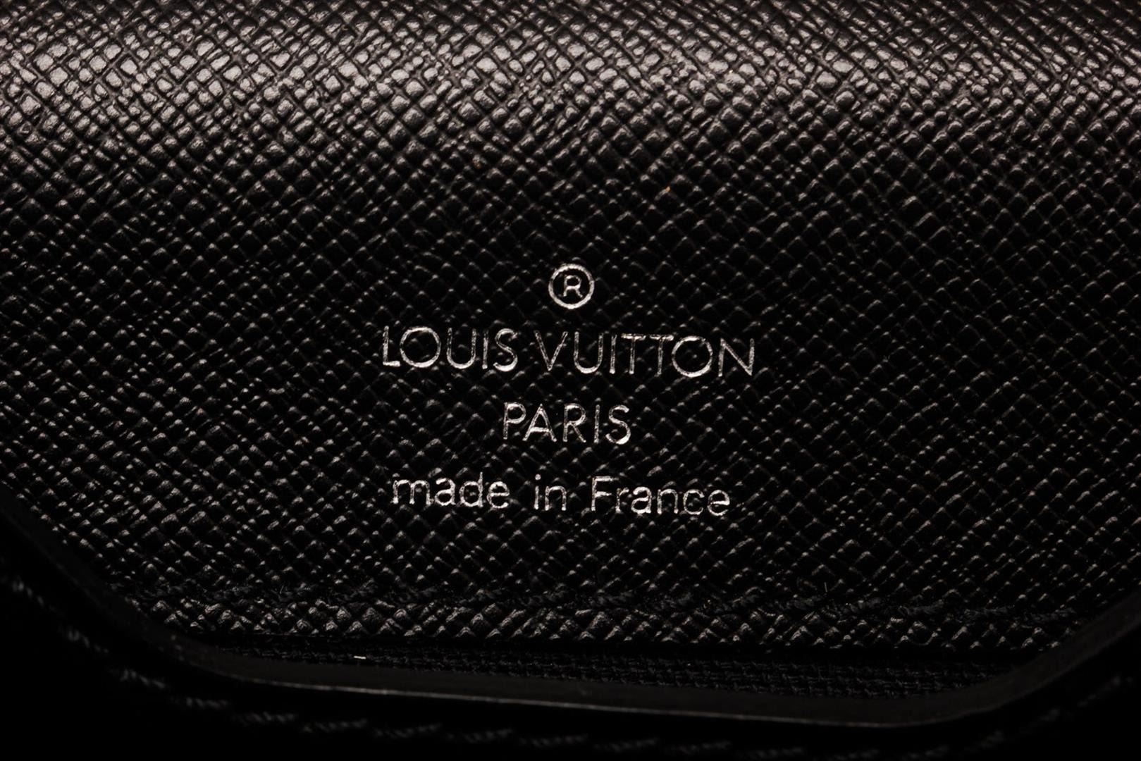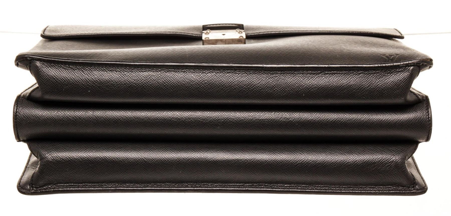 One Louis Vuitton Black Taiga Leather Robusto 3 Briefcase Bag. Item is sold AS-IS. All available information is listed in the description and shown in the photo. Louis Vuitton Black Taiga Leather Robusto 3 Briefcase Bag with taiga leather, silver-tone hardware, single rolled top handle, embossed logo accent at front corner, back exterior slit pocket, grey tonal canvas lining, three interior compartments; one with zip closure.