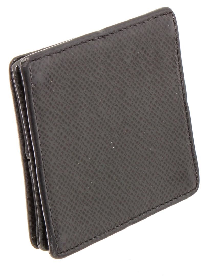 Louis Vuitton black Taiga leather square coin case with silver-tone hardware, embossed logo at front, black leather interior lining and overall snap closure at top.