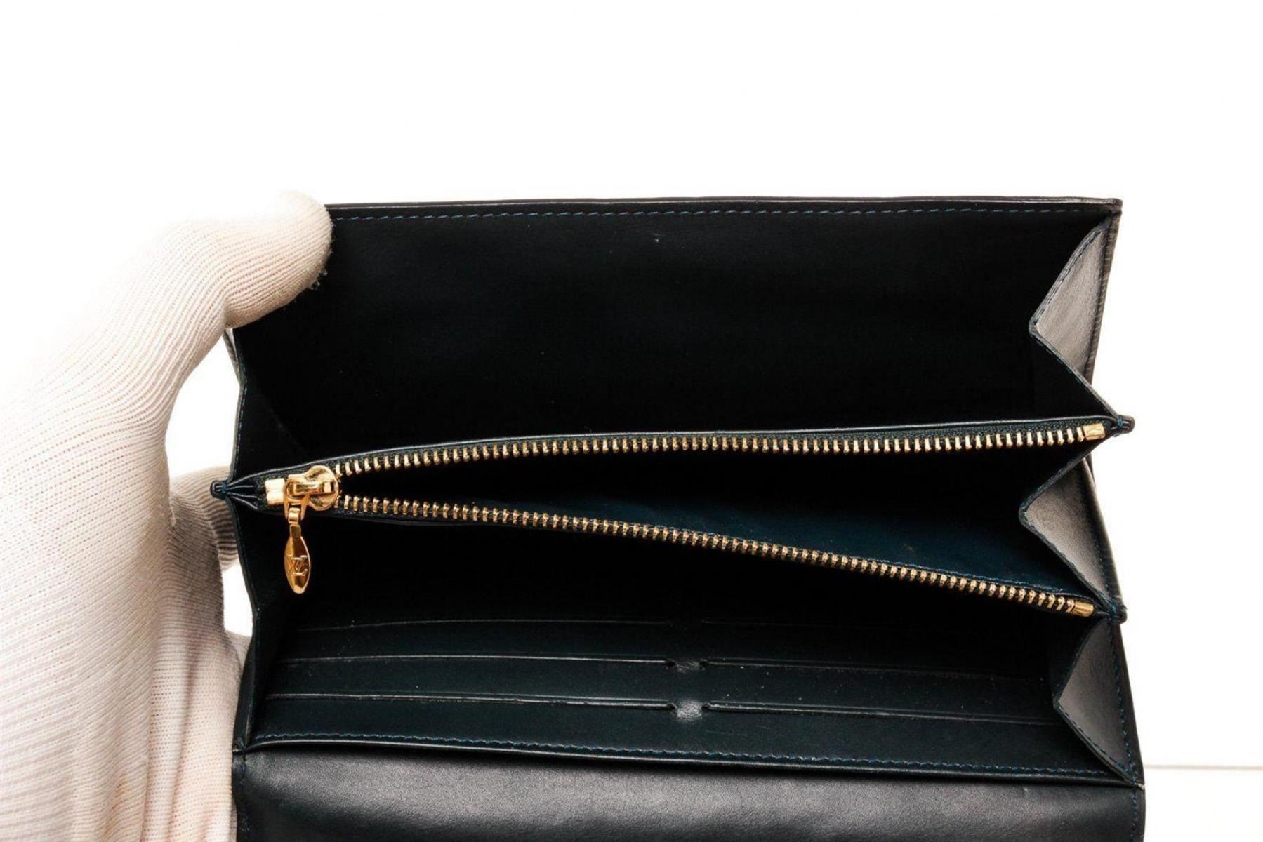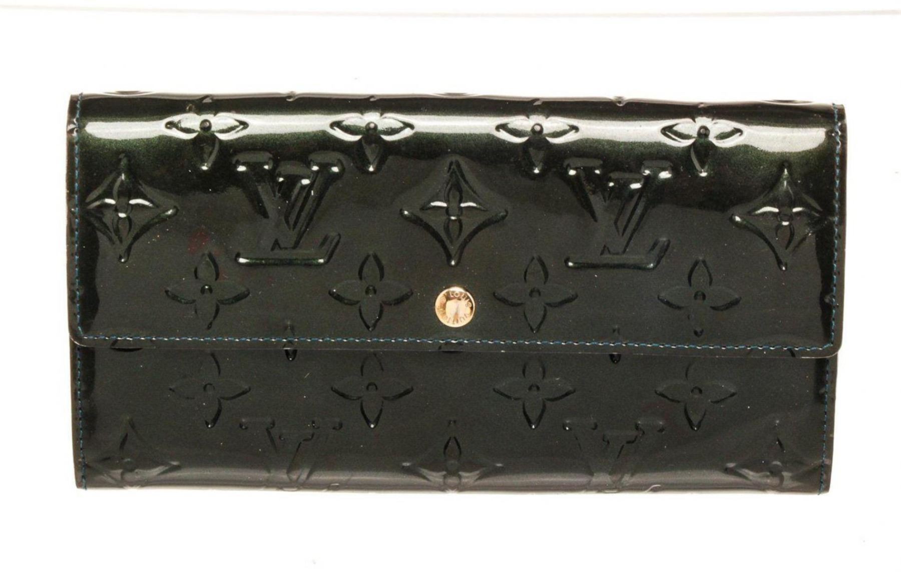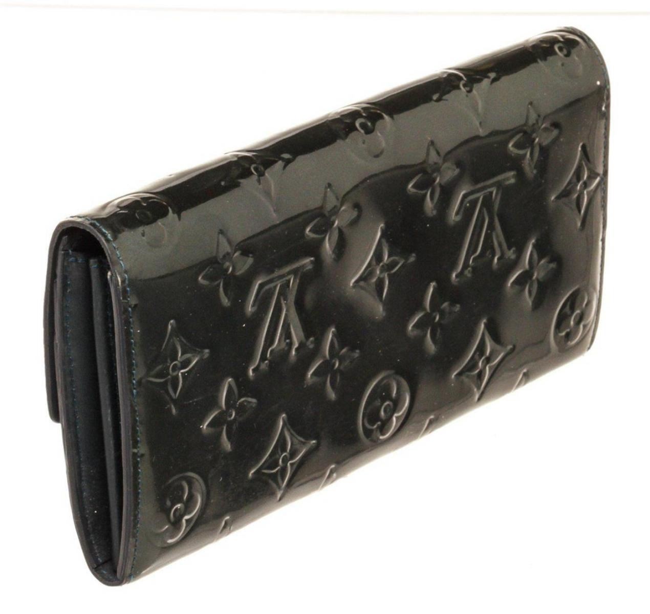 Louis Vuitton Black Vernis Leather Sarah Wallet with vernis leather, gold-tone hardware, three interior compartments pockets, trim tan vachetta leather and snap closure.