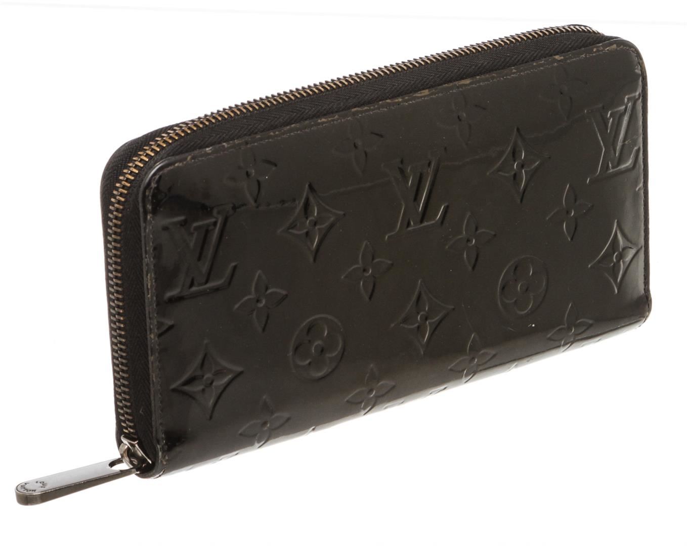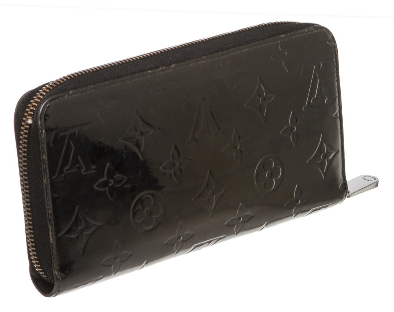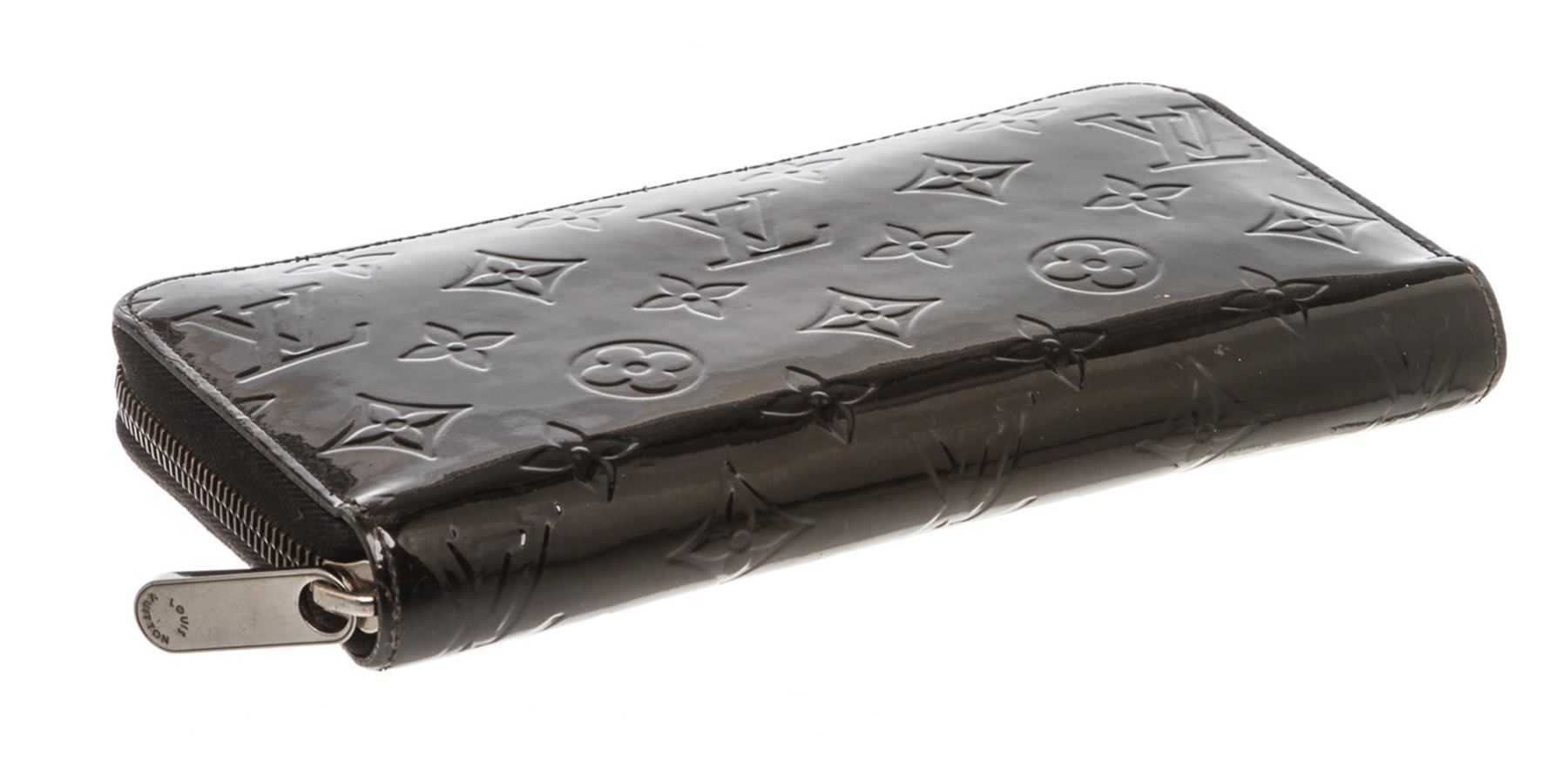 One Louis Vuitton Black Vernis Monogram Zippy Wallet. Black Monogram Vernis leather Louis Vuitton Zippy wallet with brass hardware, tonal leather lining, four interior compartments; one with zip closure, three bill compartments, eight card slots and zip-around closure.
