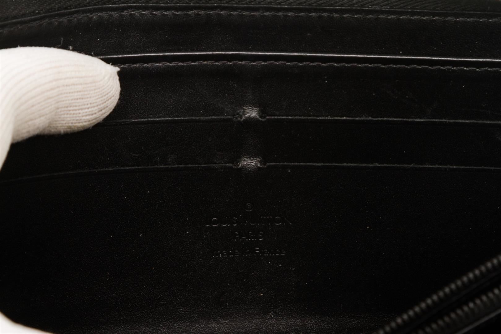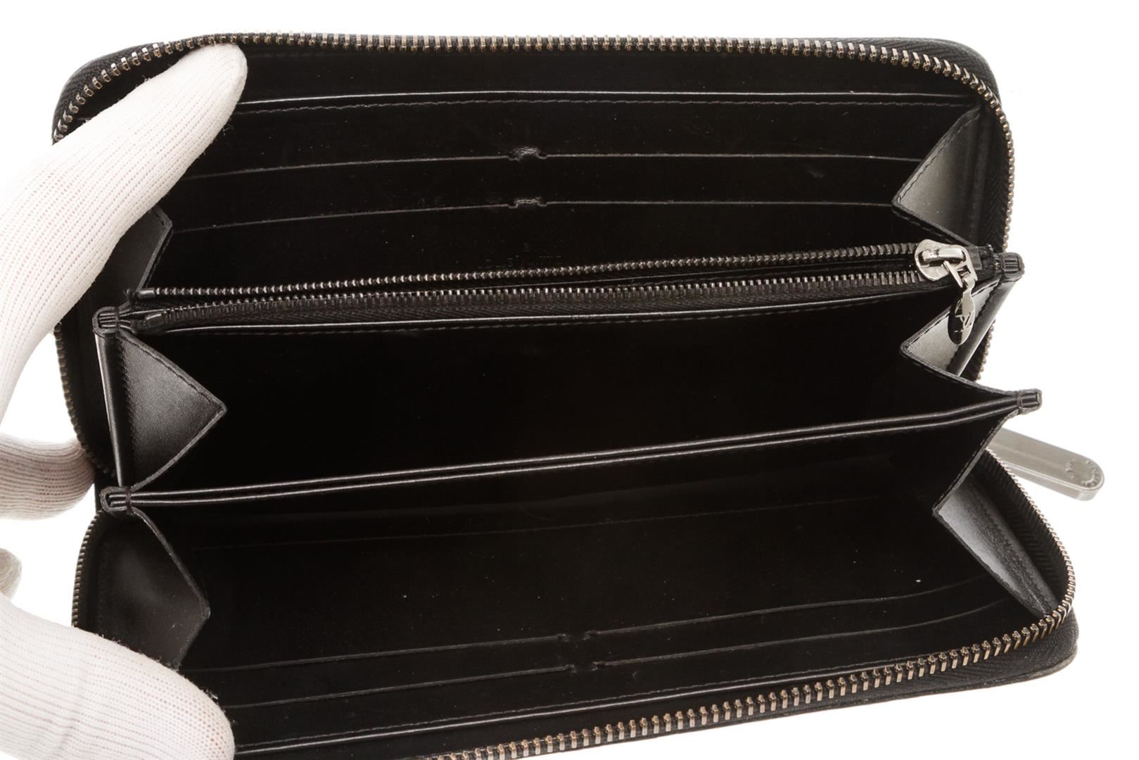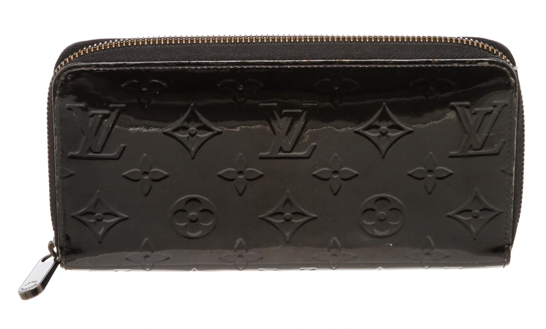 One Louis Vuitton Black Vernis Monogram Zippy Wallet. Black Monogram Vernis leather Louis Vuitton Zippy wallet with brass hardware, tonal leather lining, four interior compartments; one with zip closure, three bill compartments, eight card slots and zip-around closure.