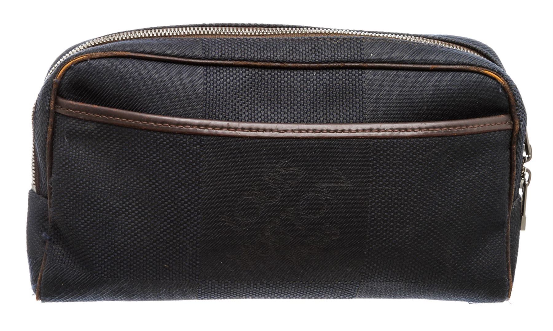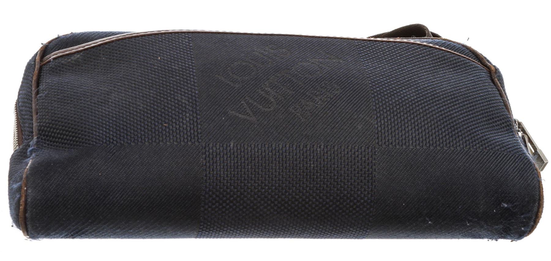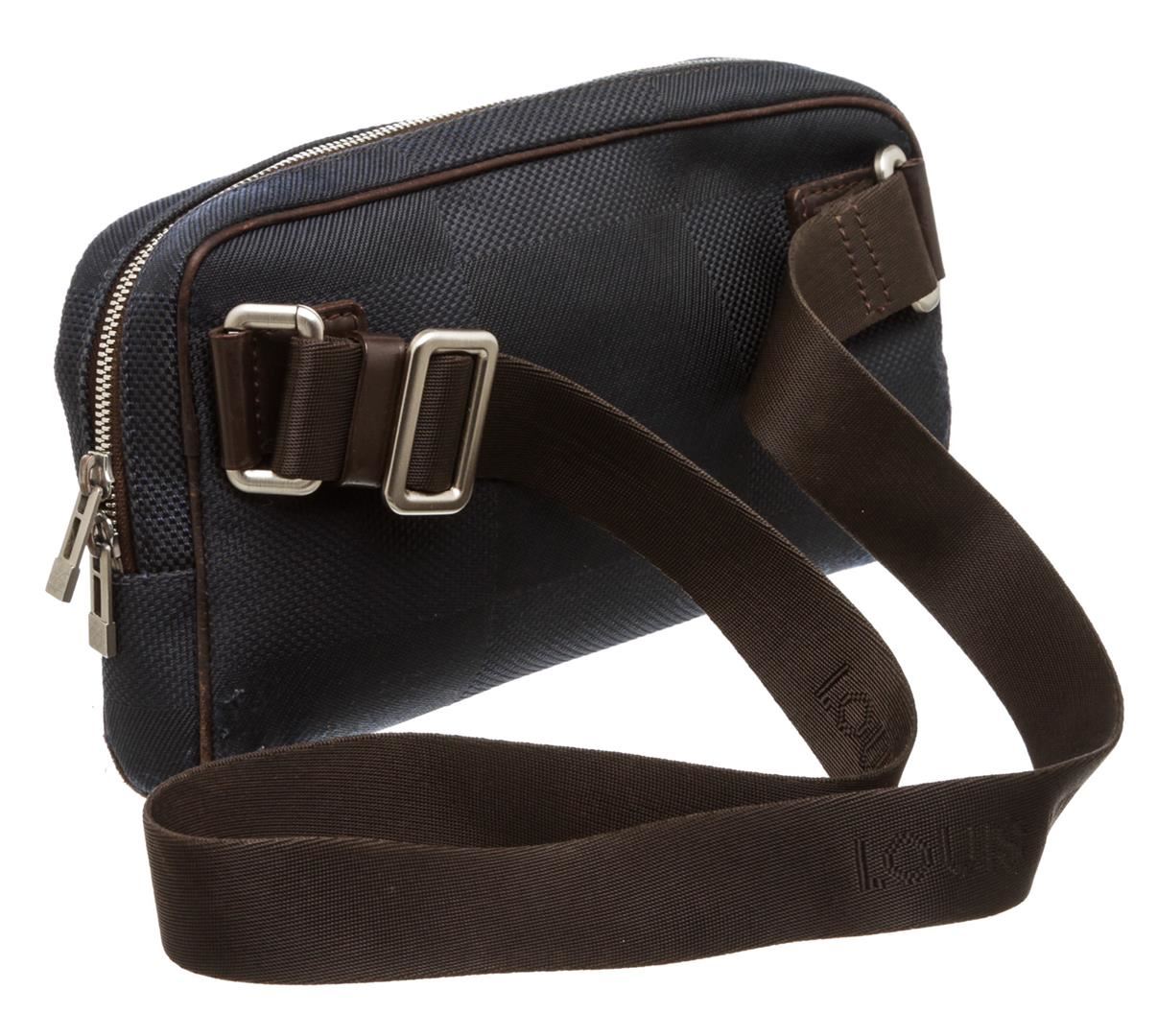 Blue Damier Geant canvas Louis Vuitton Acrobate waist bag with silver-tone hardware, concealed zip pocket at front, adjustable waist strap, woven lining featuring middle zip compartment, four card slots, single slit pocket at interior wall and zip closure at top. Authentic.