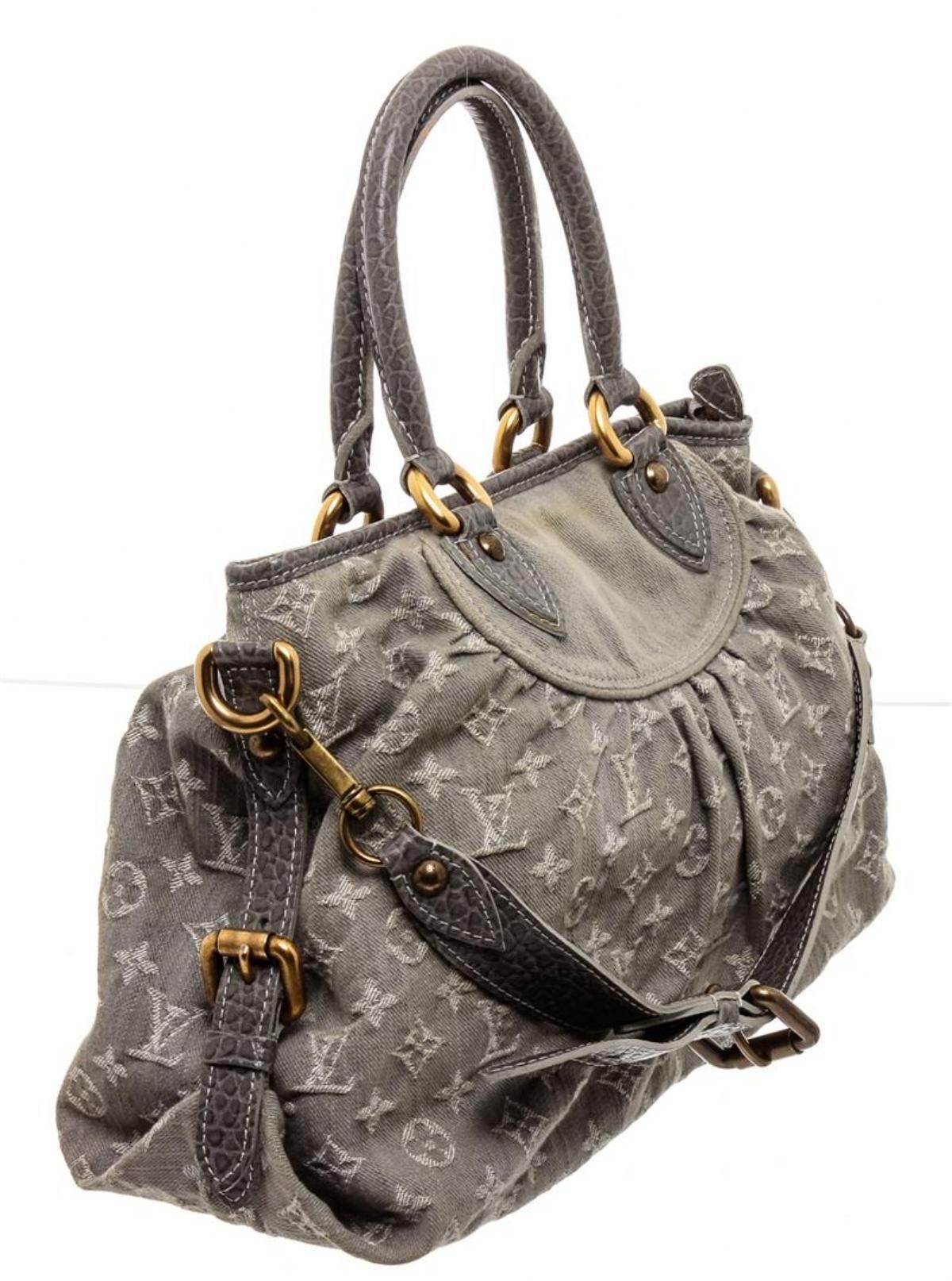 One Louis Vuitton Blue Denim Monogram Neo Cabby MM Bag. Blue denim Louis Vuitton Neo Cabby MM with brass hardware, tan leather trim, dual rolled top handles, protective feet at base, Alcantara lining, dual interior slit pockets and zip closure at top.