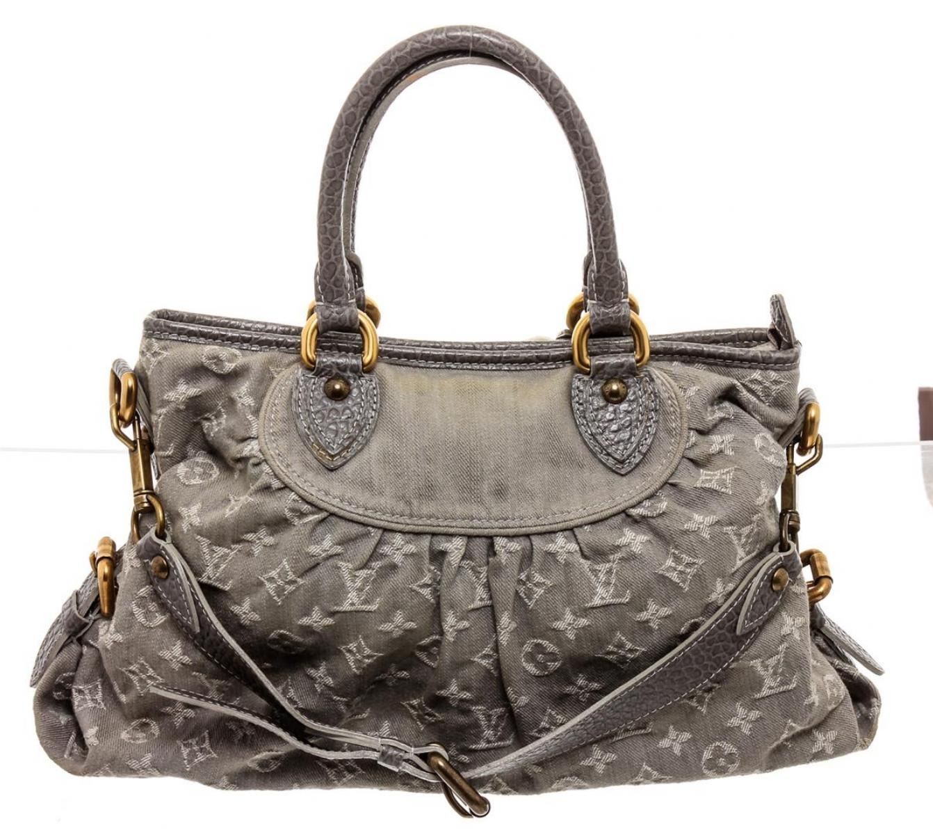 One Louis Vuitton Blue Denim Monogram Neo Cabby MM Bag. Blue denim Louis Vuitton Neo Cabby MM with brass hardware, tan leather trim, dual rolled top handles, protective feet at base, Alcantara lining, dual interior slit pockets and zip closure at top.