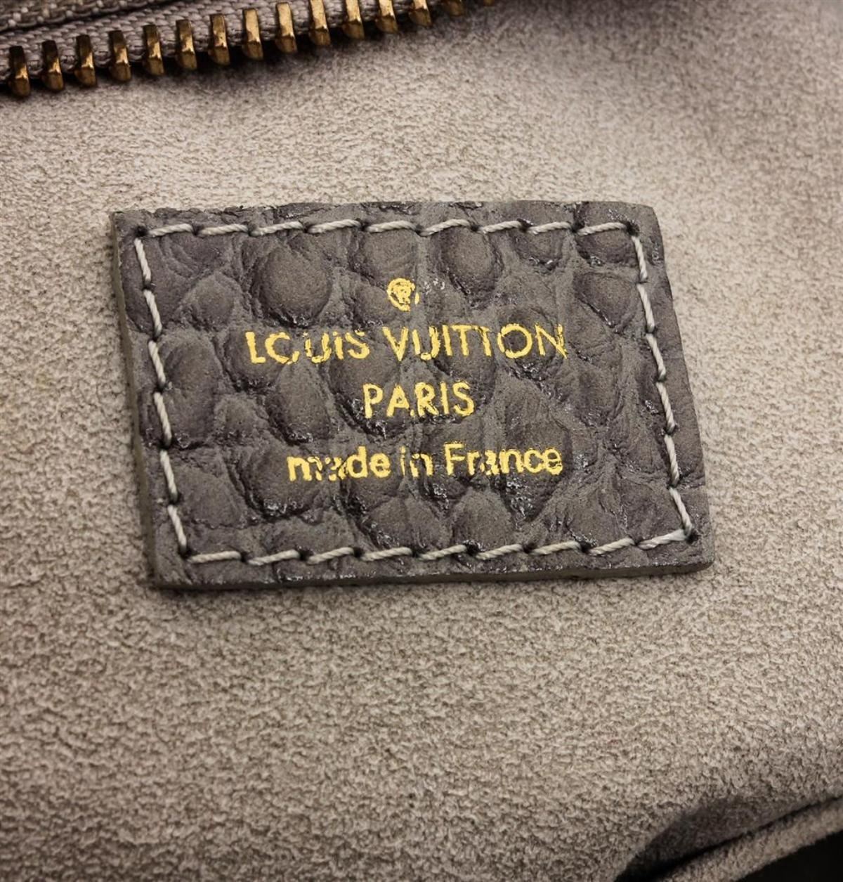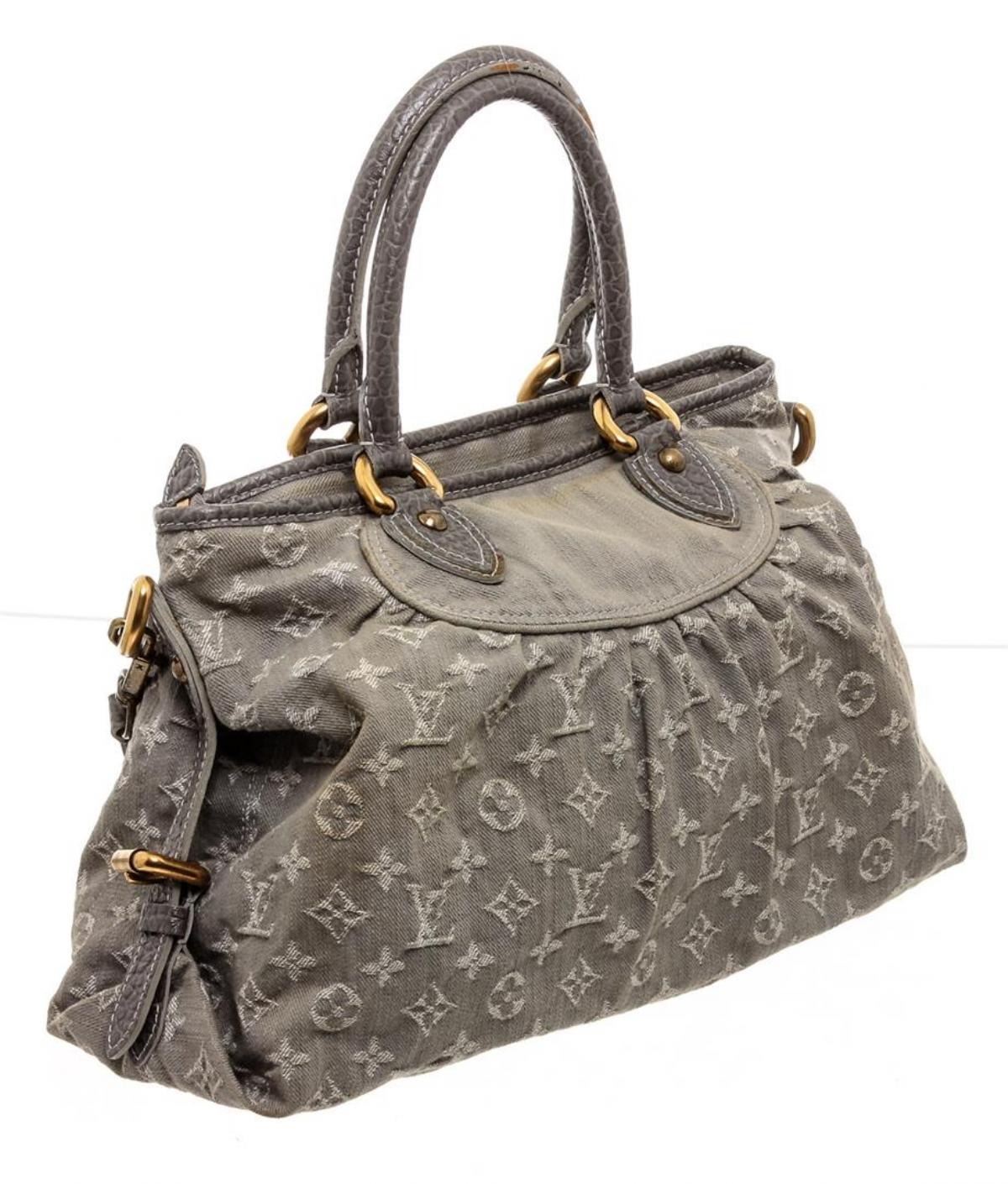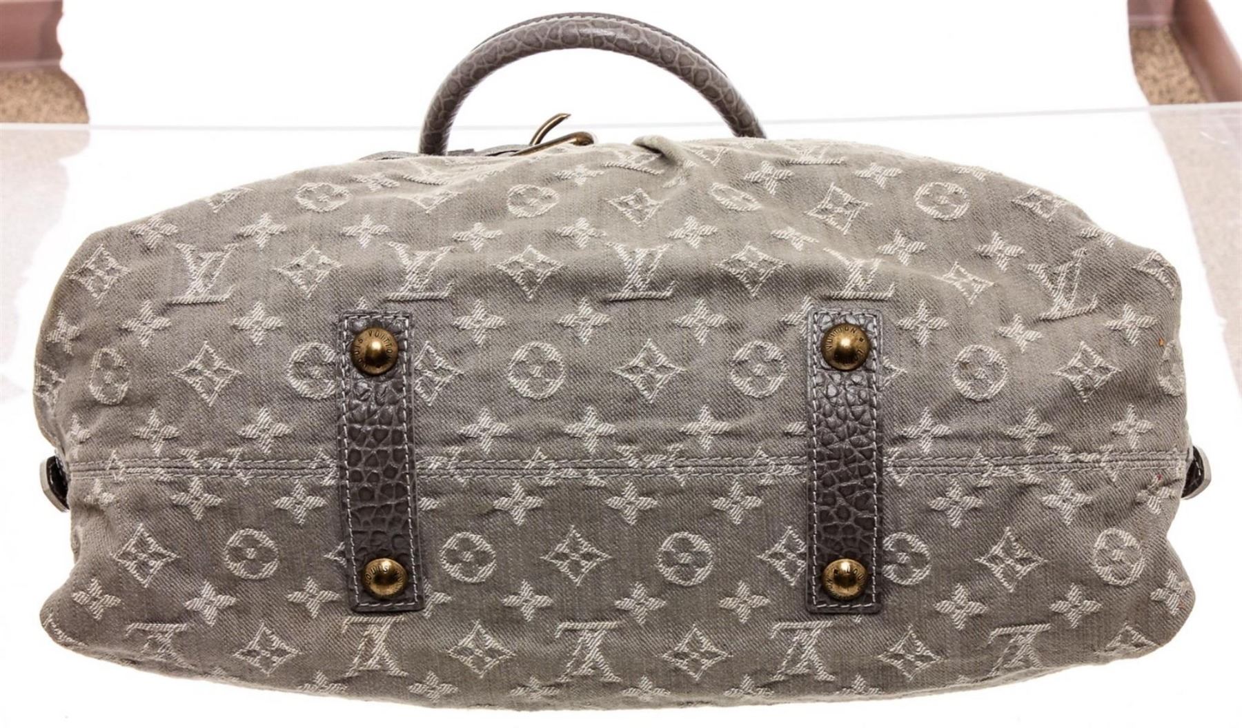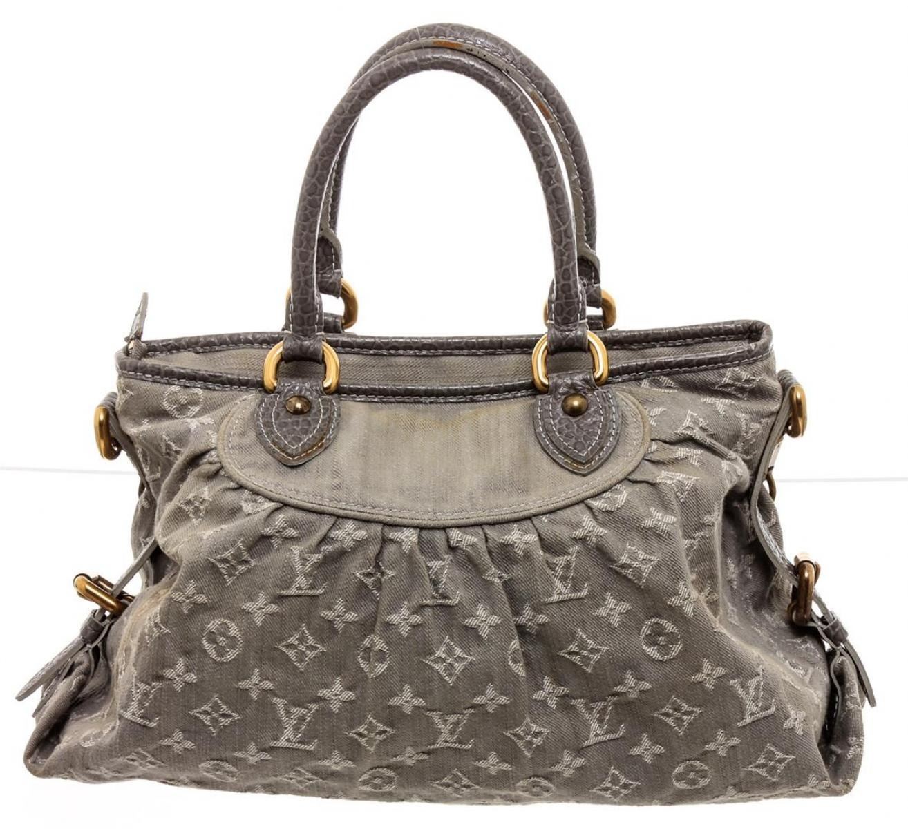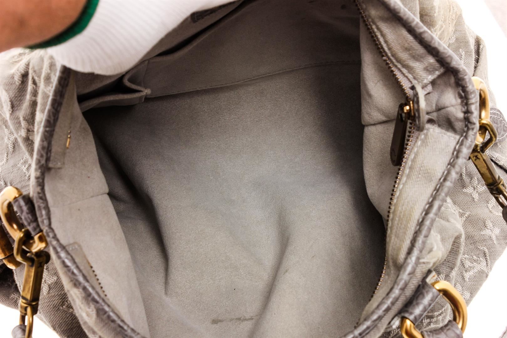 One Louis Vuitton Blue Denim Monogram Neo Cabby MM Bag. Blue denim Louis Vuitton Neo Cabby MM with brass hardware, tan leather trim, dual rolled top handles, protective feet at base, Alcantara lining, dual interior slit pockets and zip closure at top.