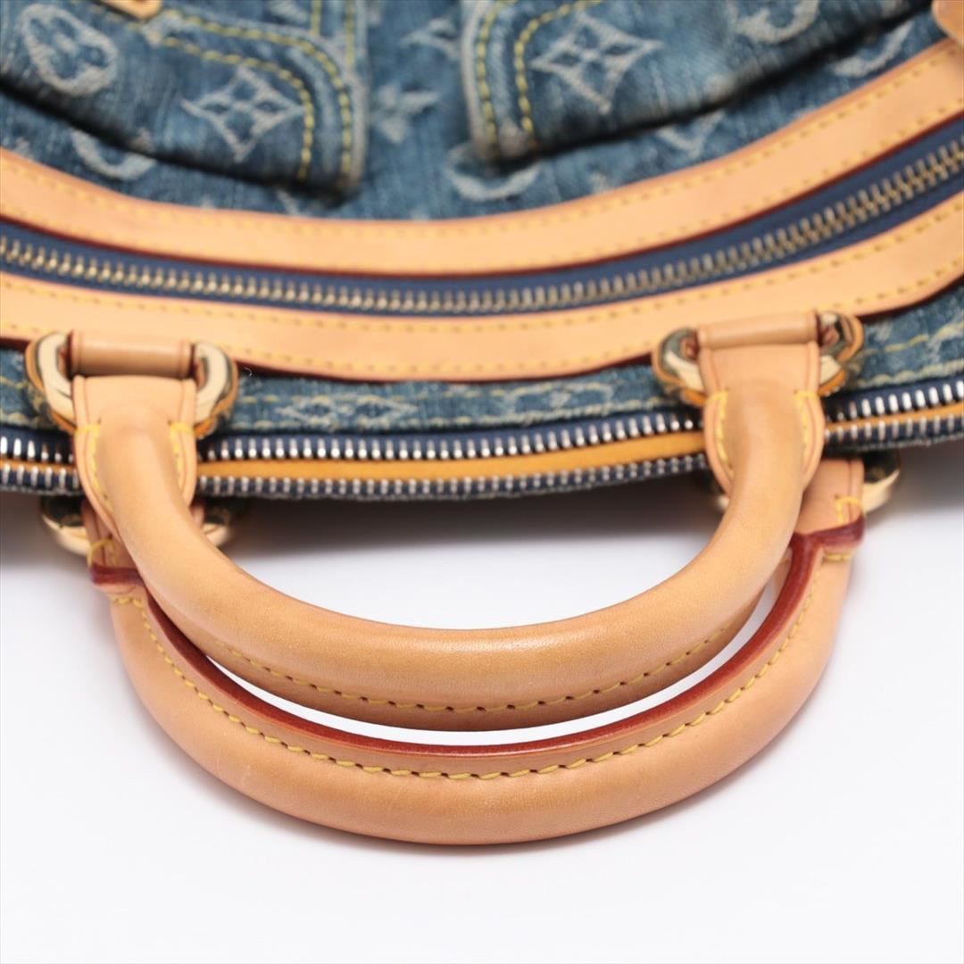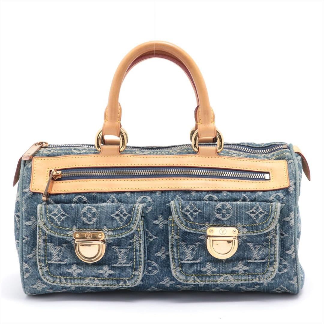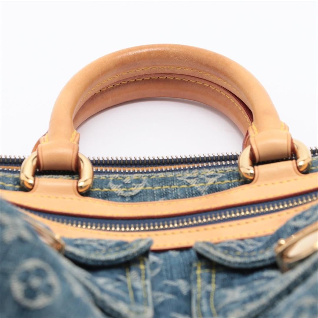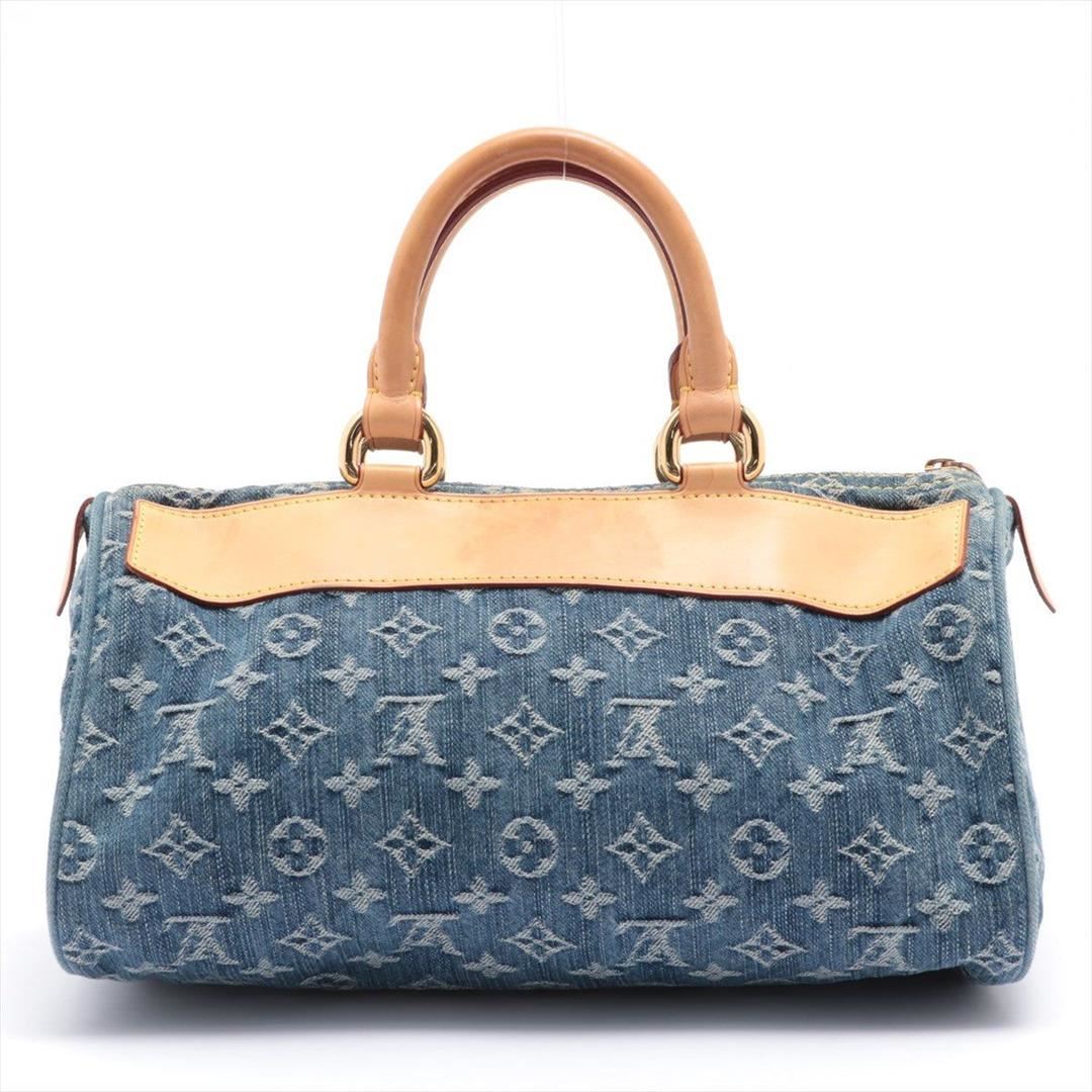 Blue monogram denim Louis Vuitton Neo Speedy with brass hardware, tan vachetta leather trim, dual rolled top handles, three exterior pockets; one with zip closure, mimosa Alcantara lining, single slip pocket at interior wall and zip closure at top.