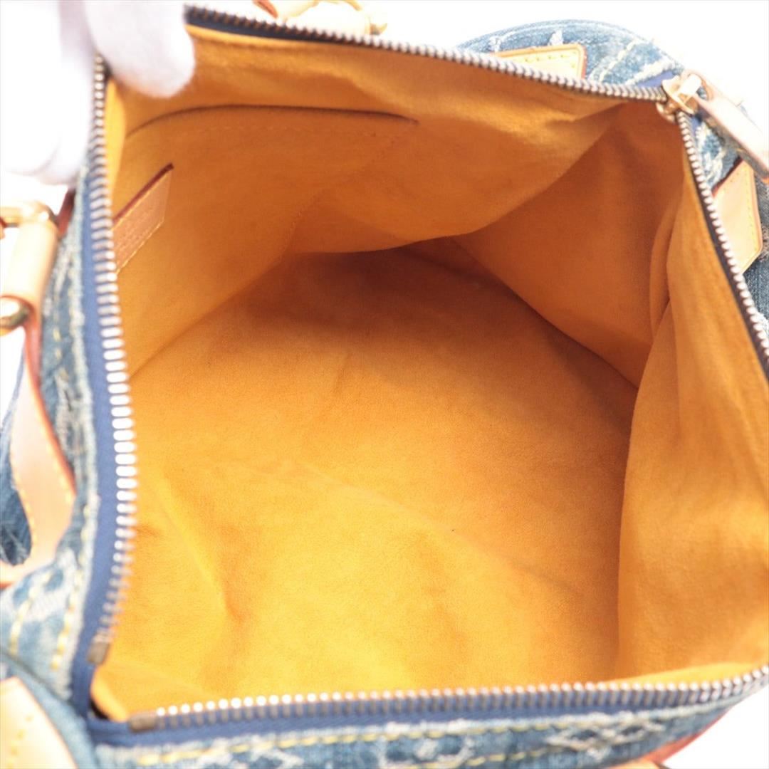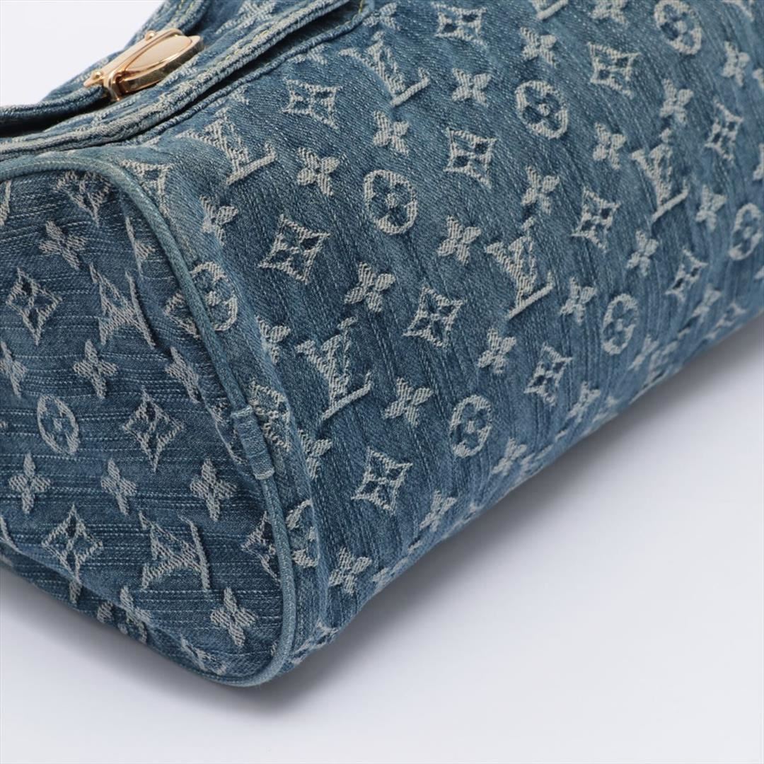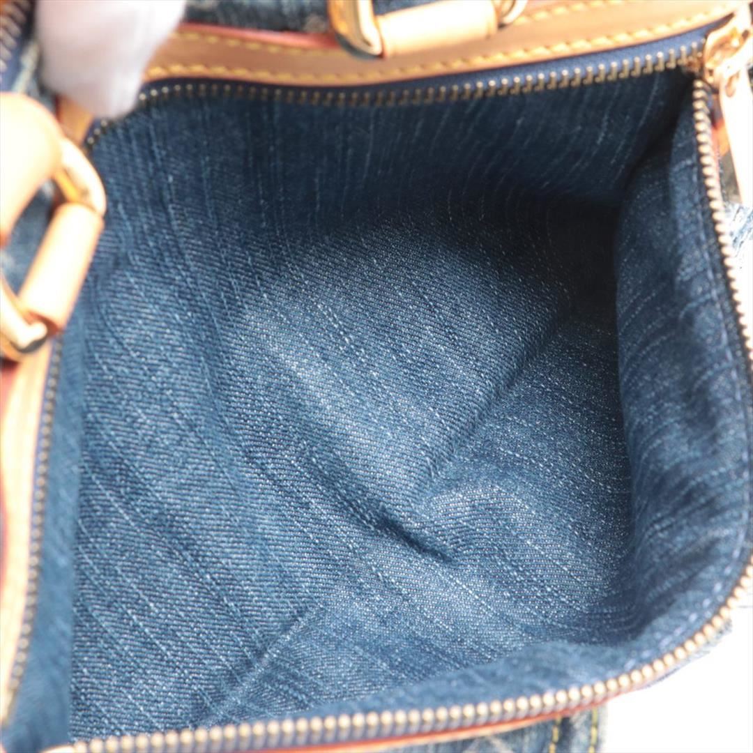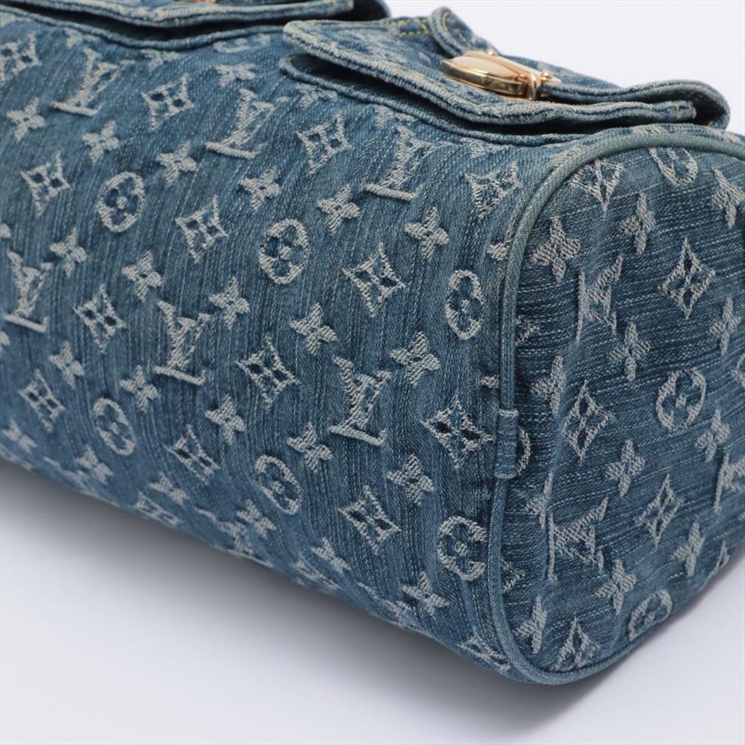 Blue monogram denim Louis Vuitton Neo Speedy with brass hardware, tan vachetta leather trim, dual rolled top handles, three exterior pockets; one with zip closure, mimosa Alcantara lining, single slip pocket at interior wall and zip closure at top.
