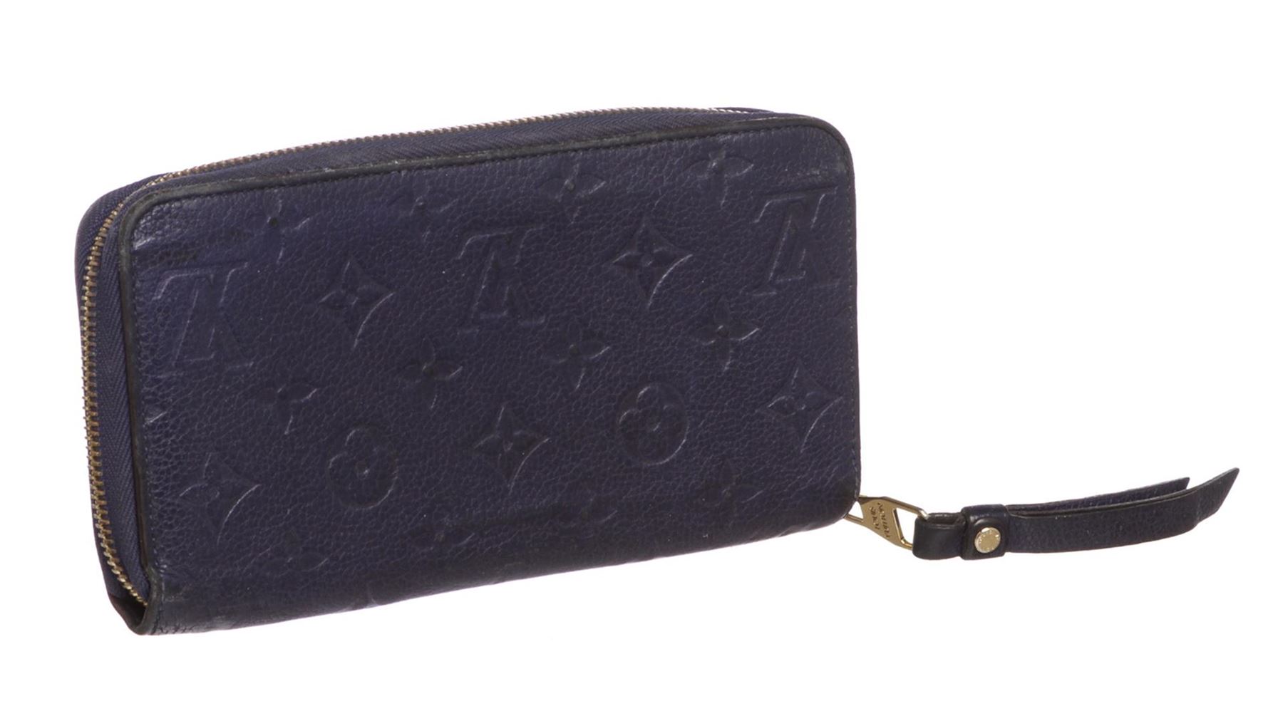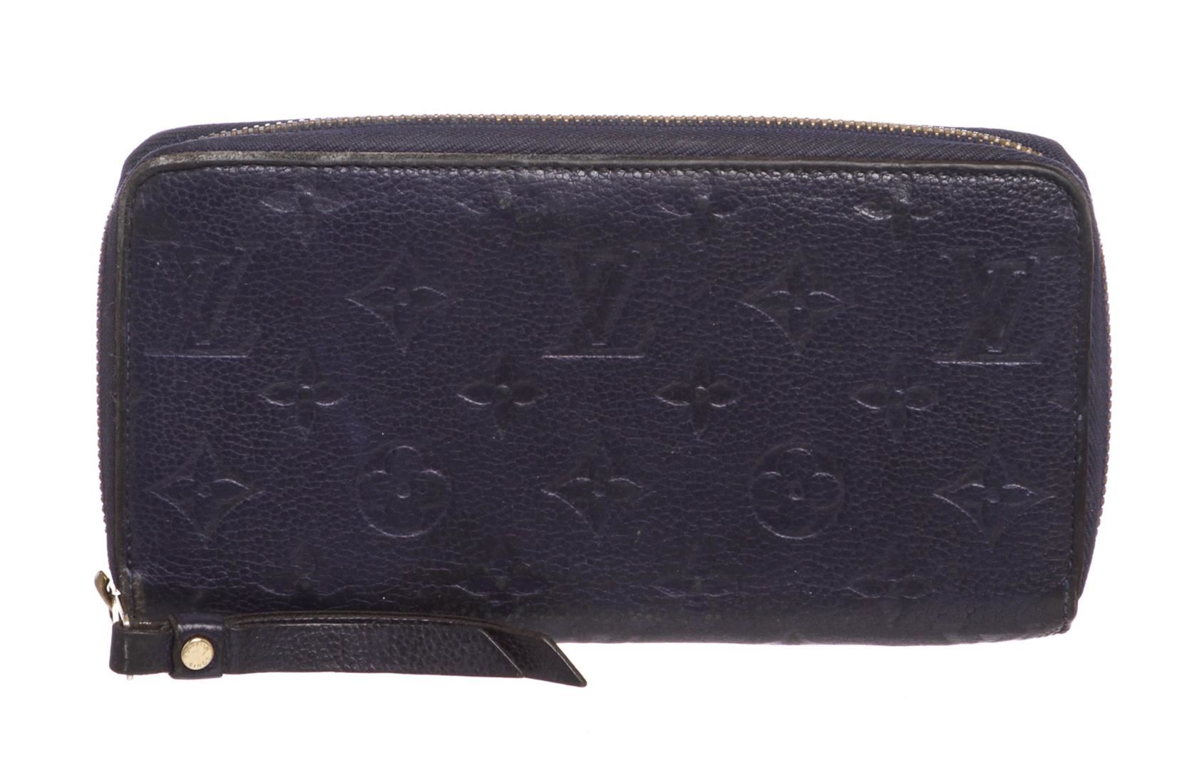Monogram Blue Empreinte leather Louis Vuitton Zippy wallet with brass hardware, tonal leather lining, dual bill compartments, single zip pocket at interior wall, ten card slots and zip-around closure. Authentic.