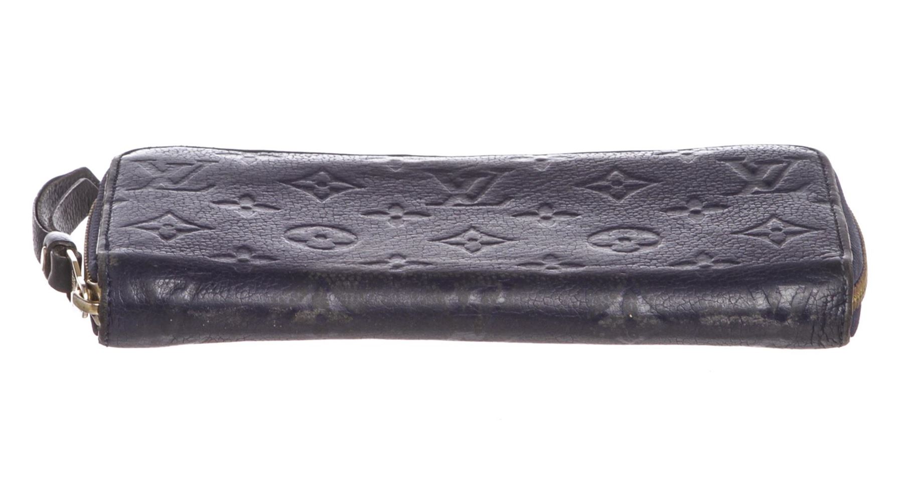 Monogram Blue Empreinte leather Louis Vuitton Zippy wallet with brass hardware, tonal leather lining, dual bill compartments, single zip pocket at interior wall, ten card slots and zip-around closure. Authentic.