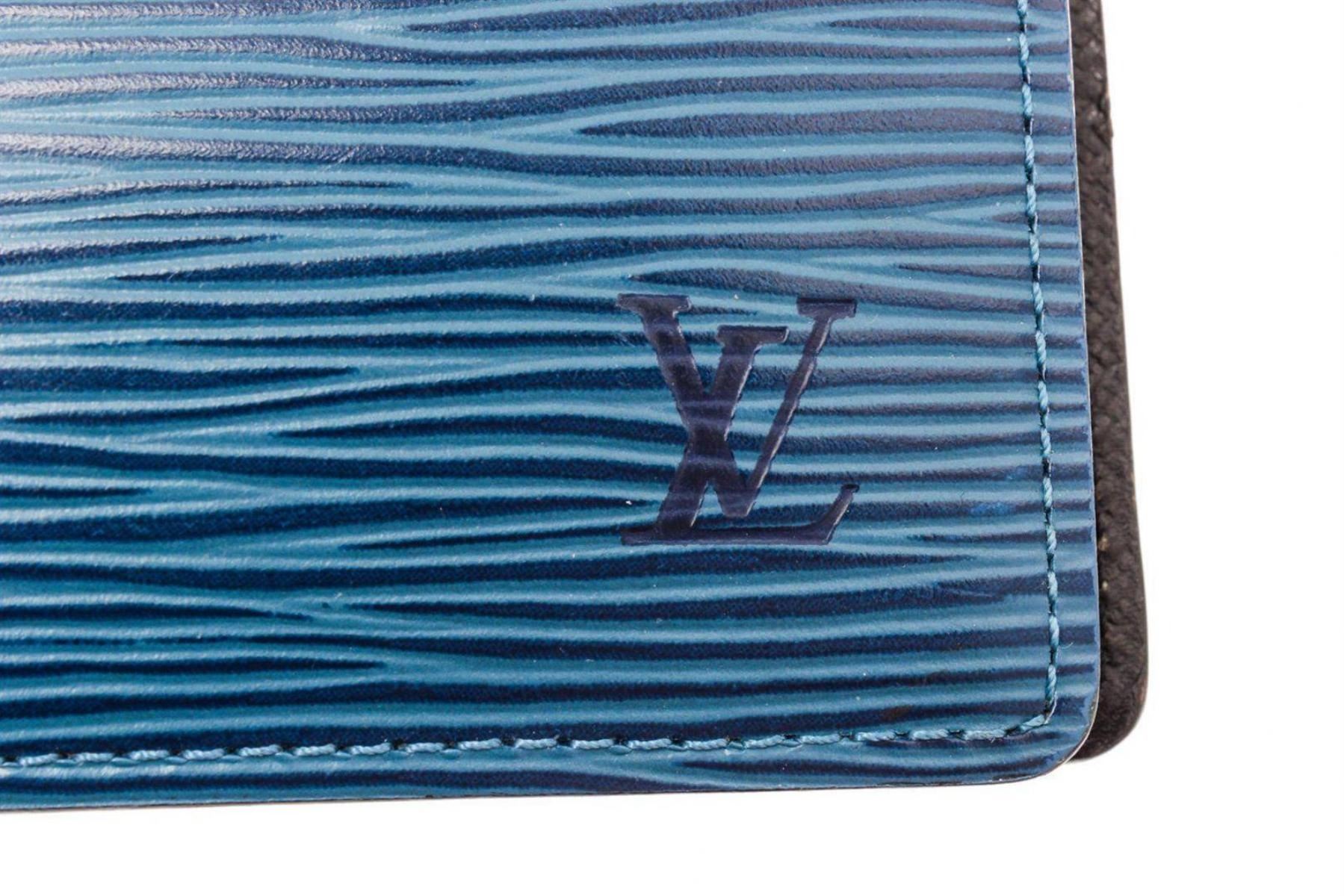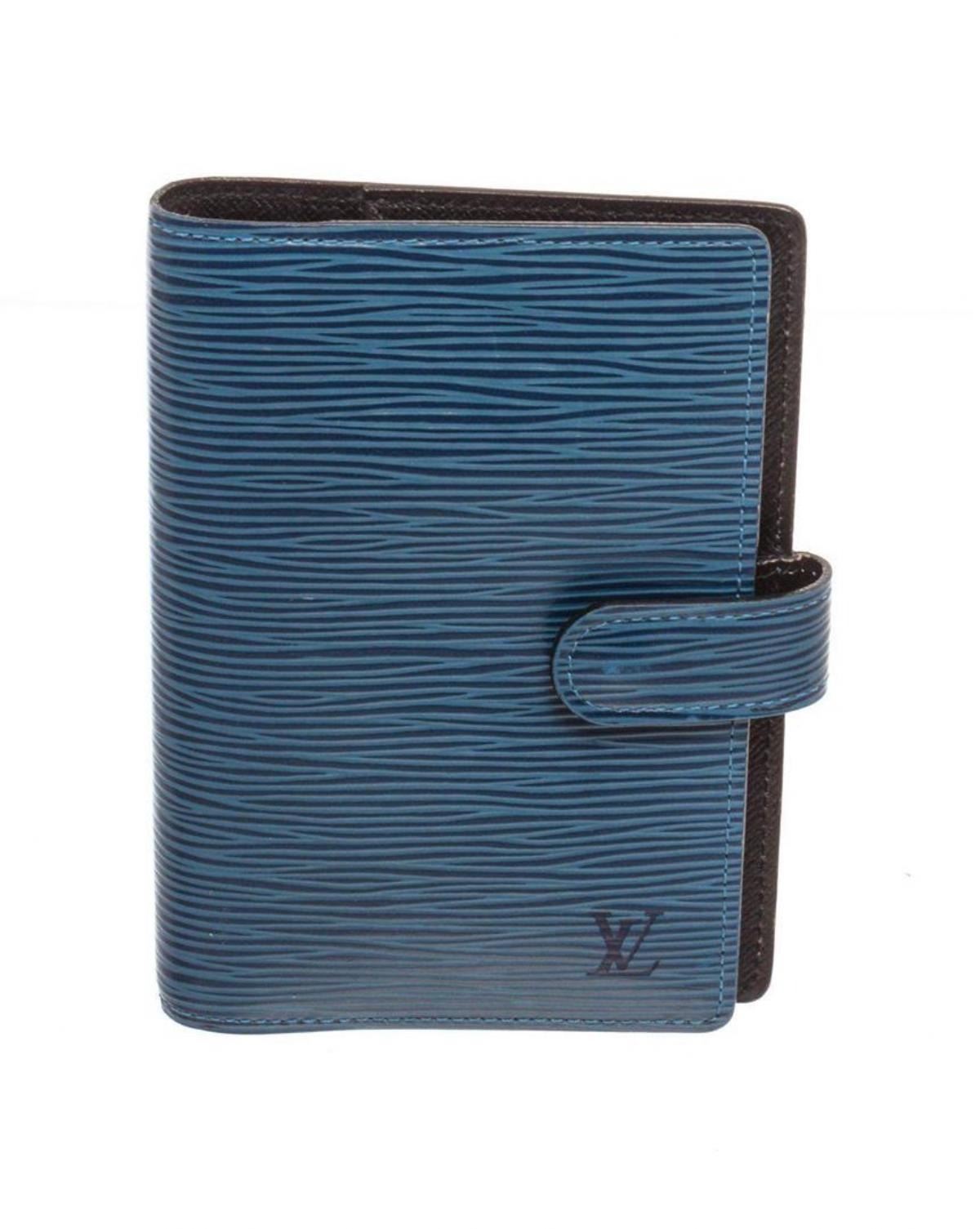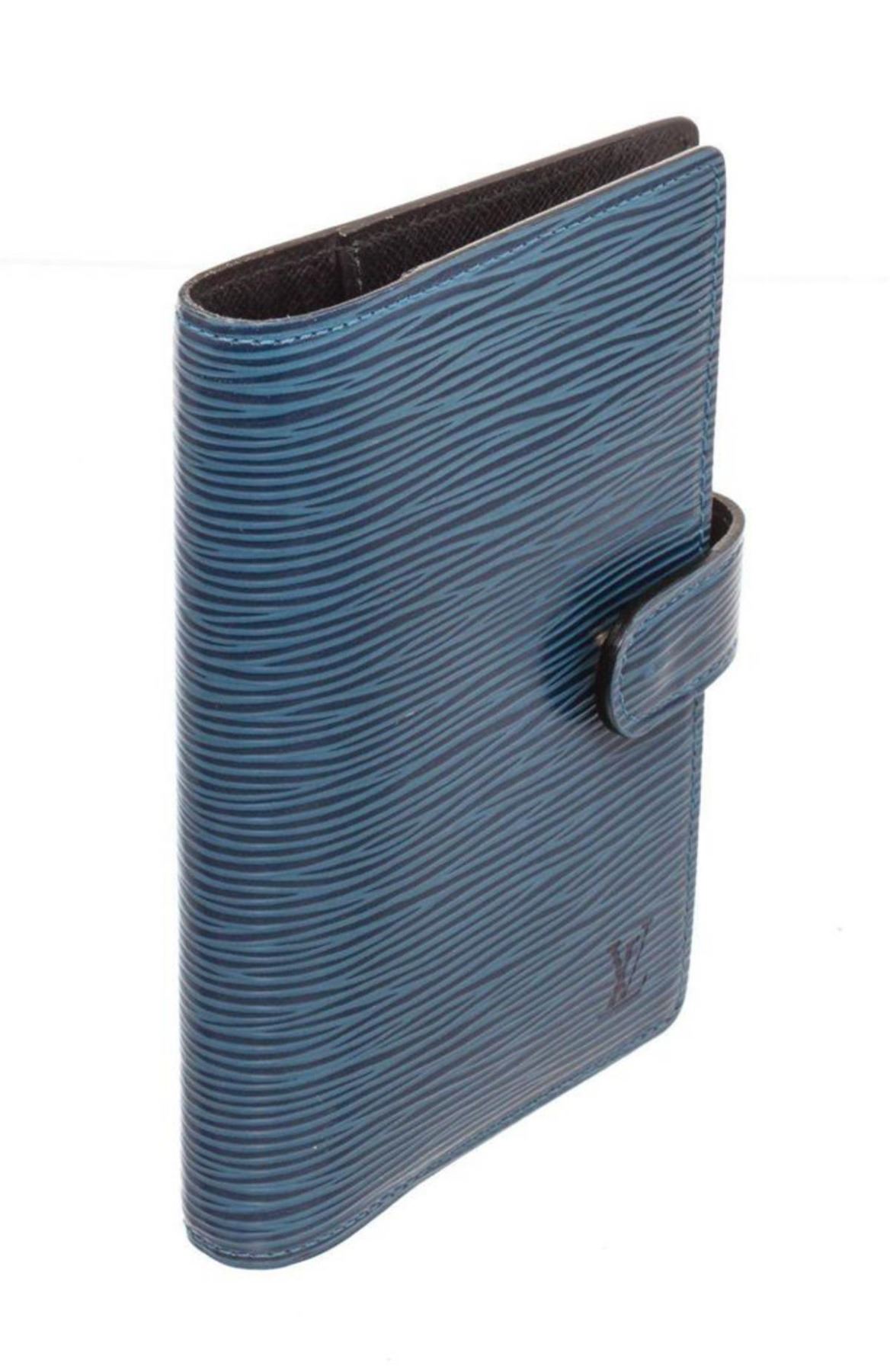 Louis Vuitton Blue Epi Leather Agenda PM Wallet with material epi leather, gold-tone hardware, trim tan vachetta leather, interior slip pockets and snap closure. Measurements: Length 4.5 in / 11 cm Width 6 in / 15 cm Height 1 in / 3 cm Condition: Pre-Owned Good overall, please see photographs for detail.