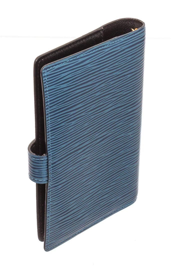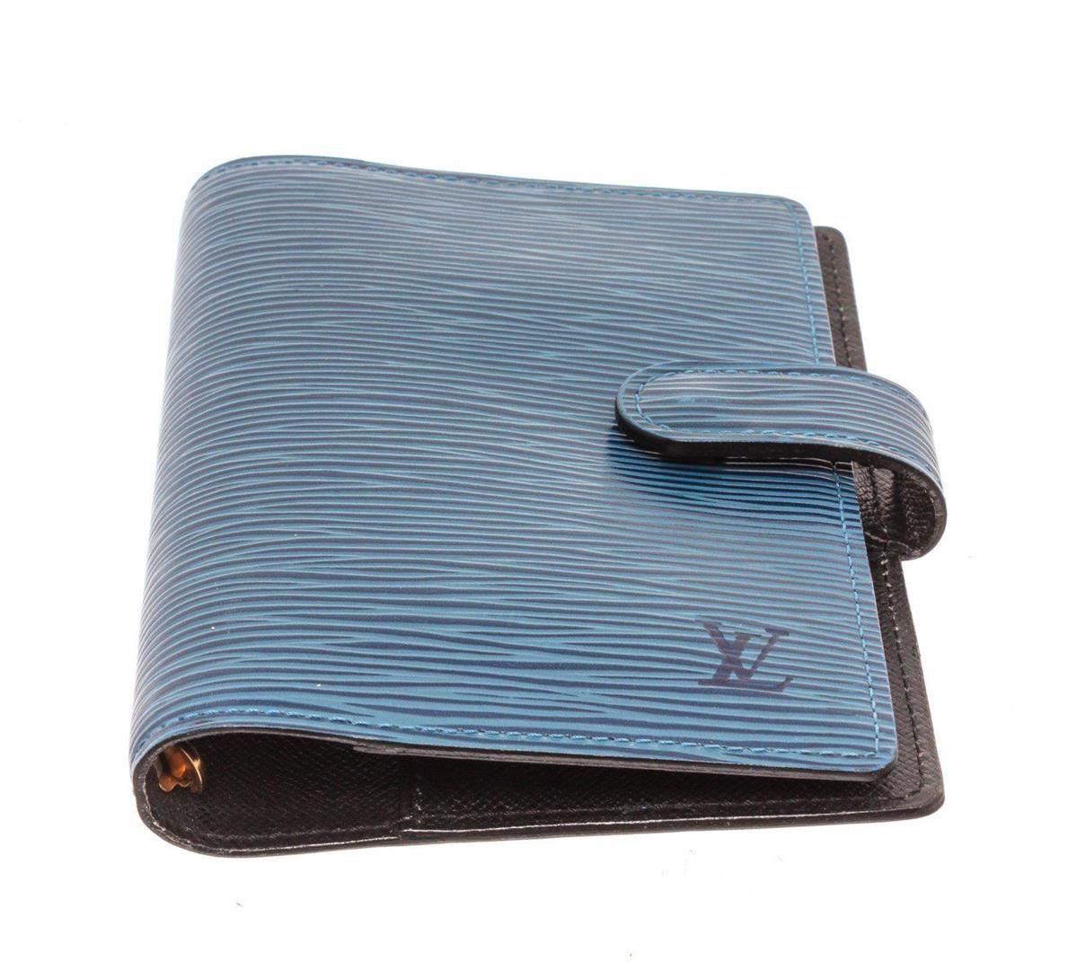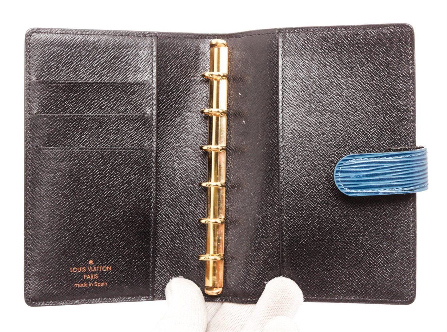 Louis Vuitton Blue Epi Leather Agenda PM Wallet with material epi leather, gold-tone hardware, trim tan vachetta leather, interior slip pockets and snap closure. Measurements: Length 4.5 in / 11 cm Width 6 in / 15 cm Height 1 in / 3 cm Condition: Pre-Owned Good overall, please see photographs for detail.
