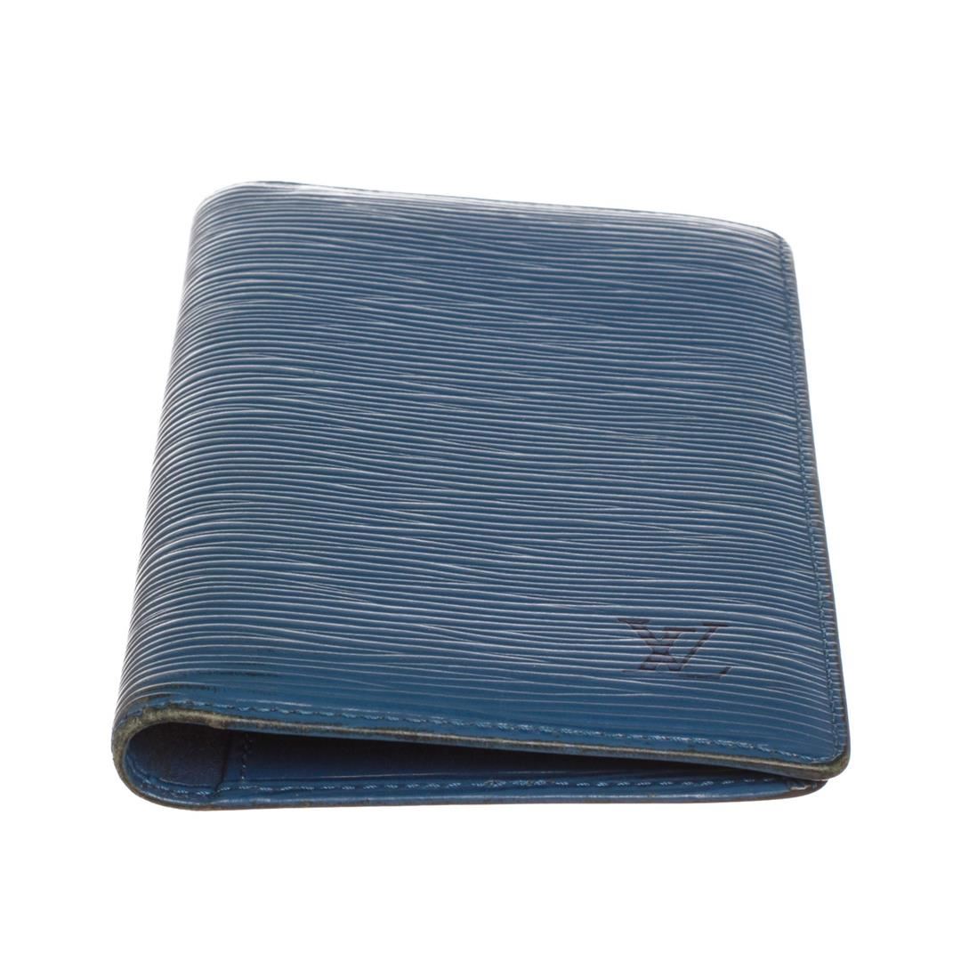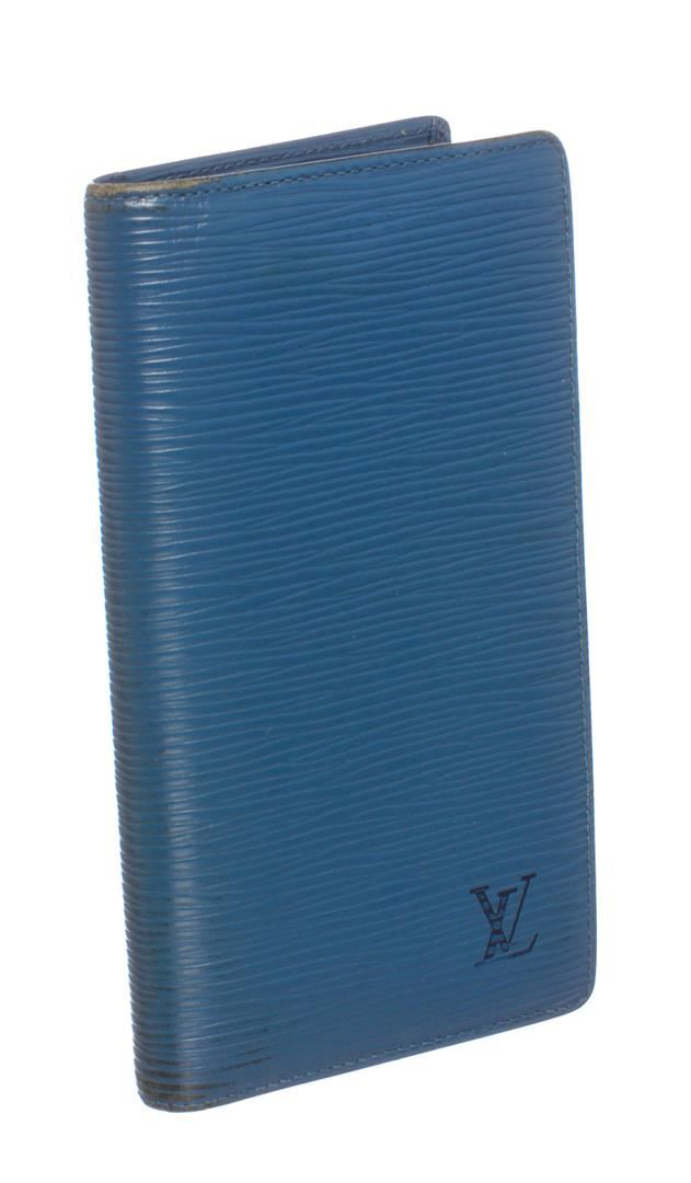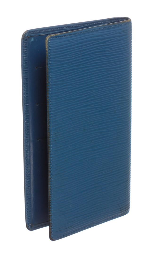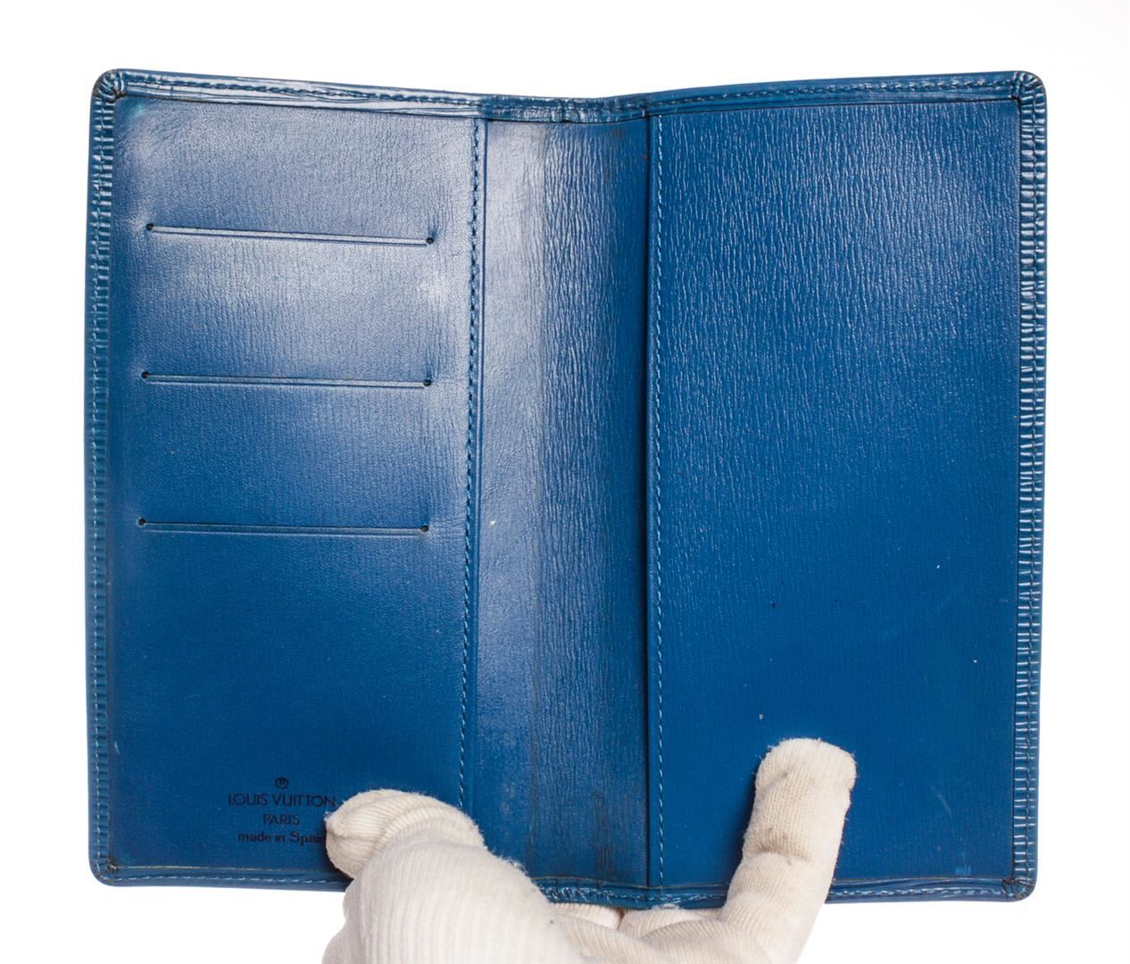 Blue Epi leather Louis Vuitton checkbook cover with tonal stitching, tonal leather interior, single checkbook compartment, dual bill compartment and three card slots.