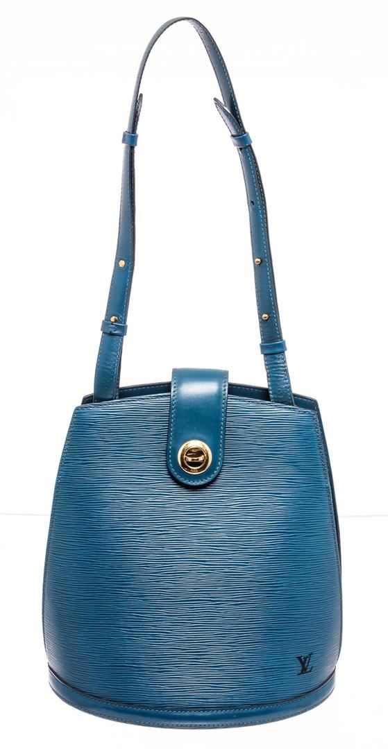 Blue Epi leather Louis Vuitton Cluny shoulder bag with brass hardware, single flat shoulder strap with peg-in-hole adjustment, embossed logo at front corner, tonal Alcantara lining, single pocket at interior wall and turn-lock closure at front flap.