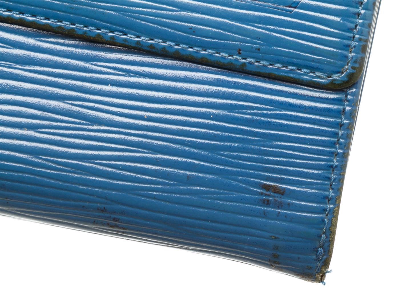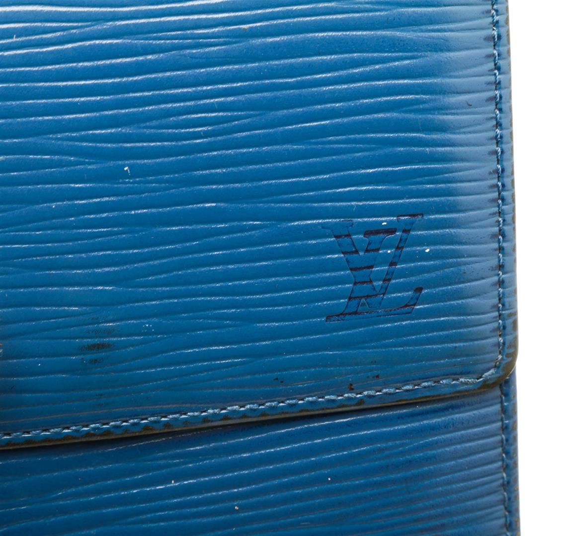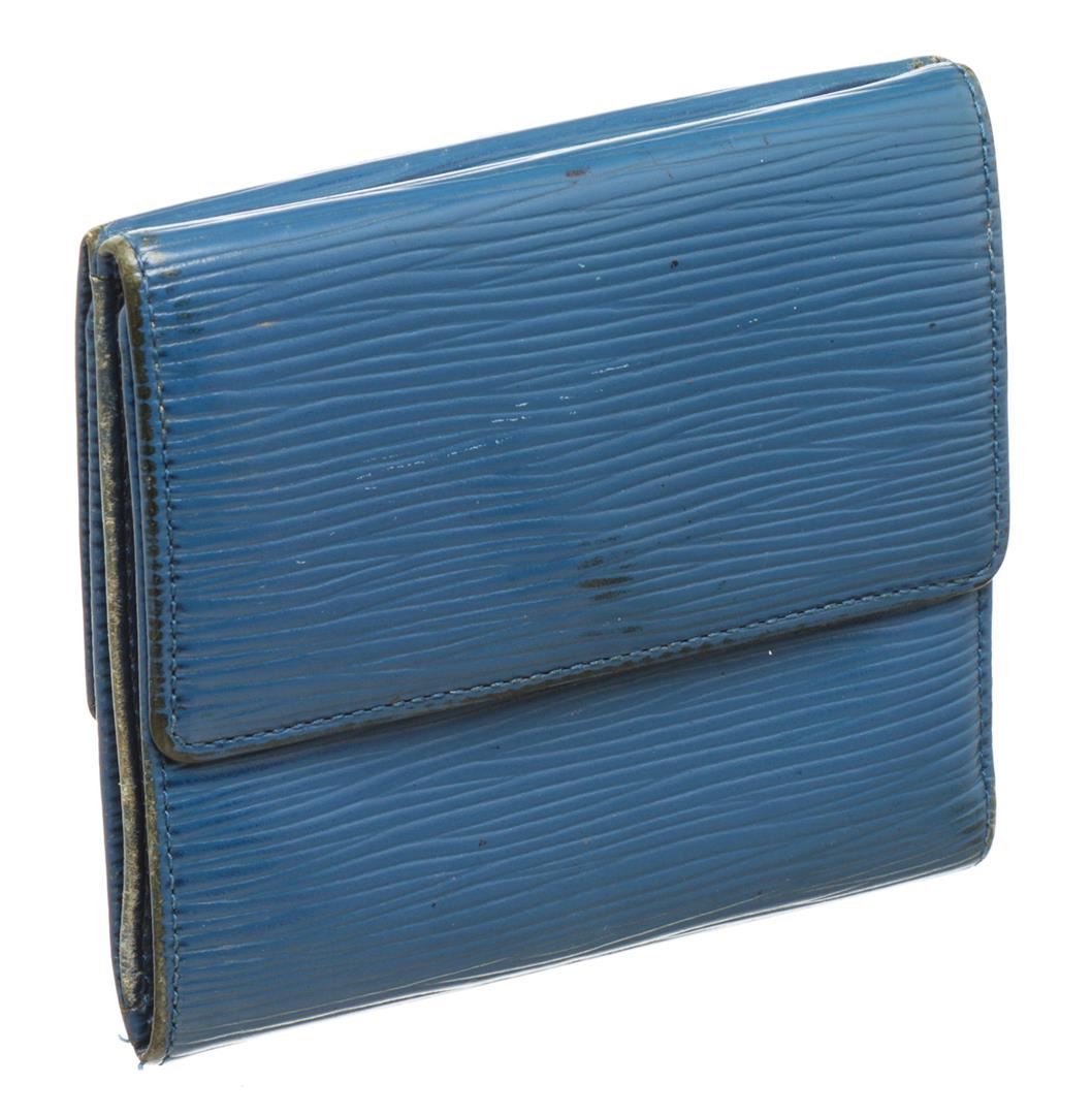 One Louis Vuitton Blue Epi Leather Elise Wallet. Blue Epi leather Louis Vuitton Elise wallet with gold-tone hardware, single pocket at front with snap closure, tonal leather lining, single bill compartment, six card slots and snap closure at back. MKX