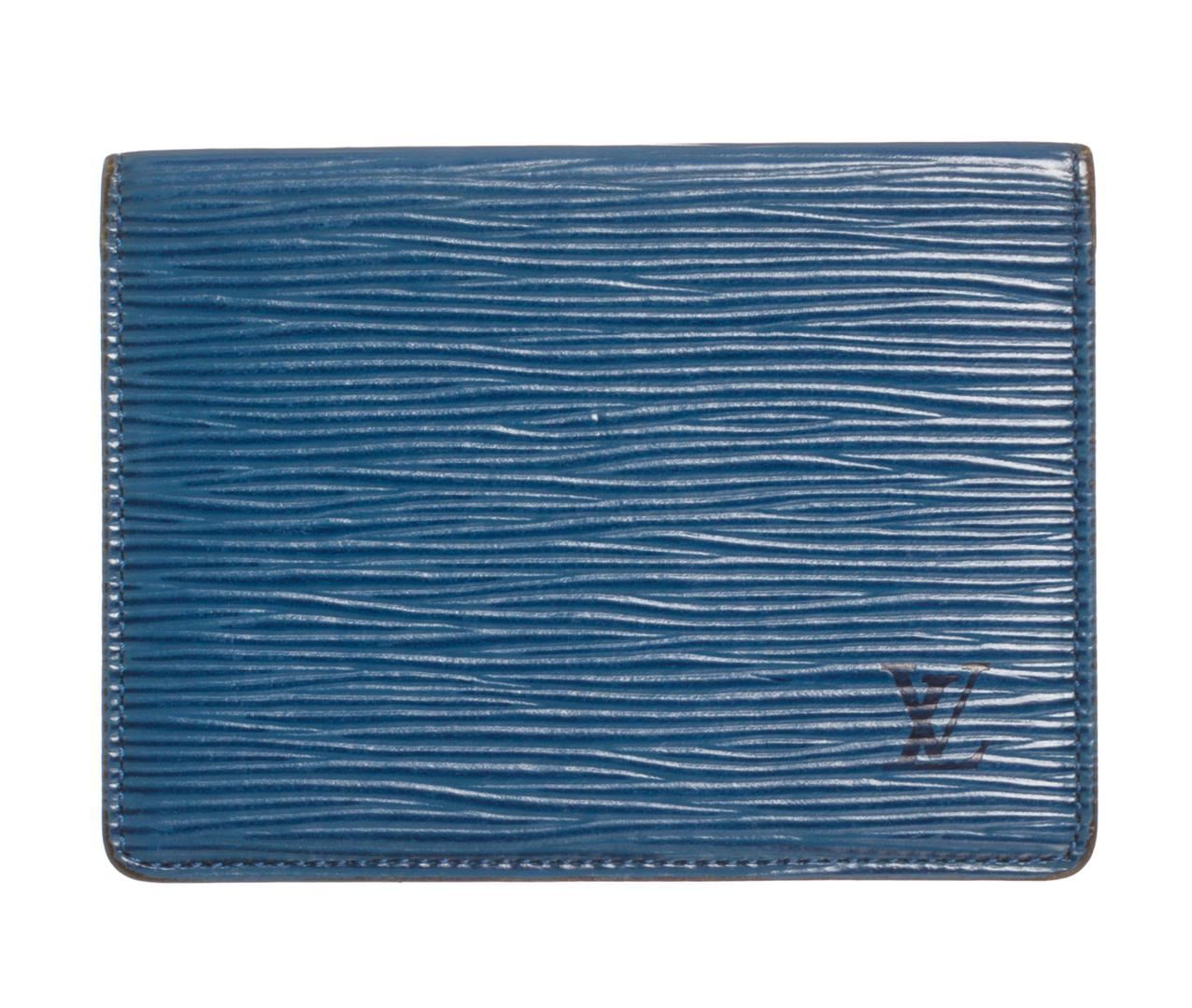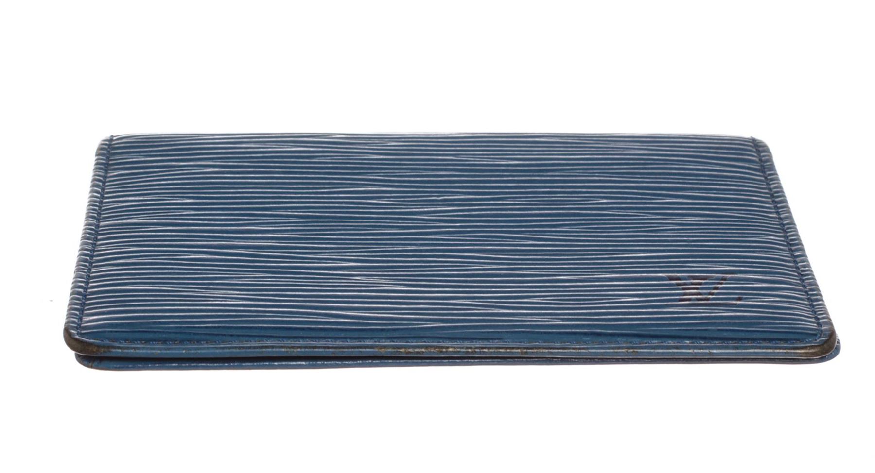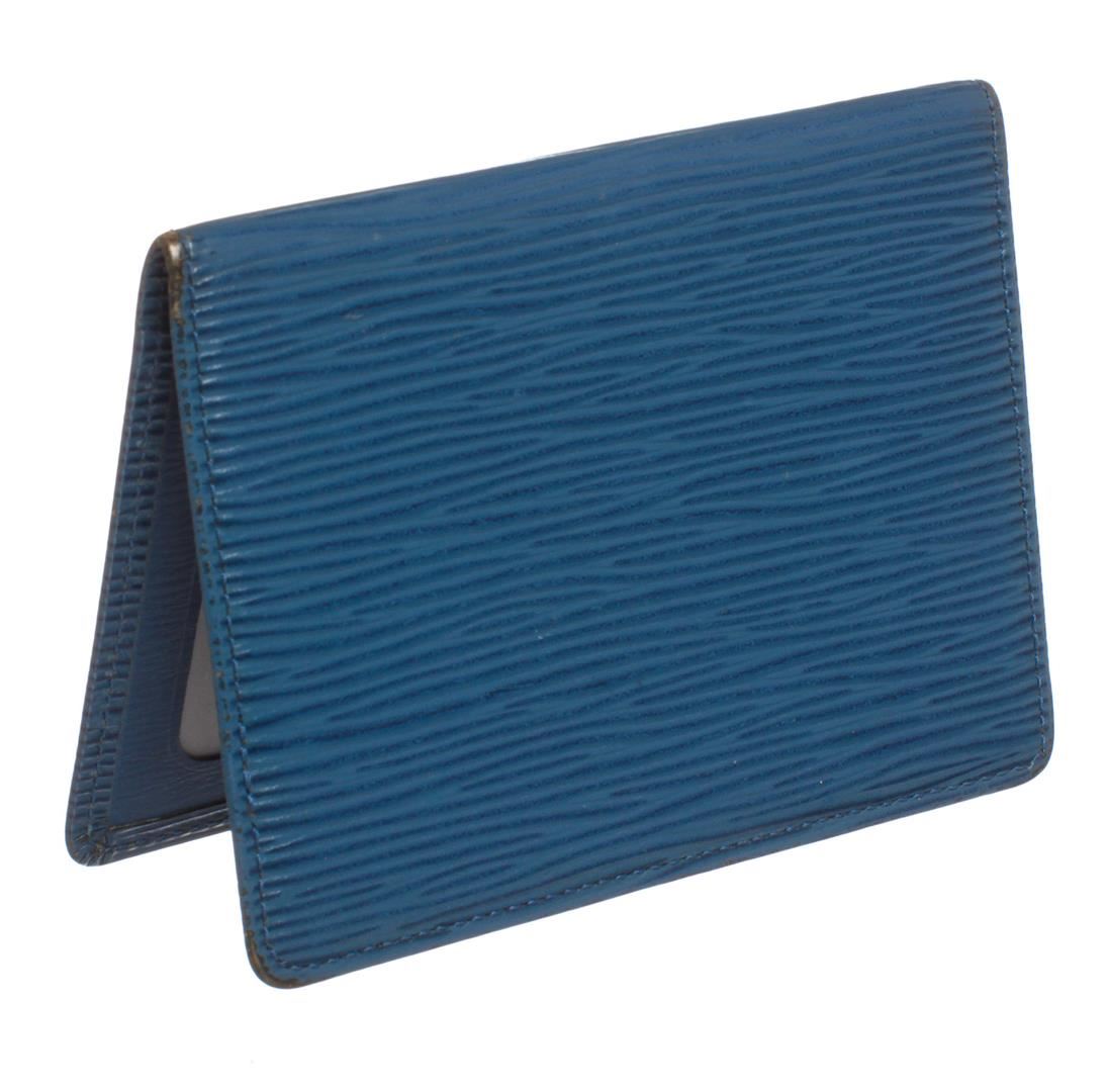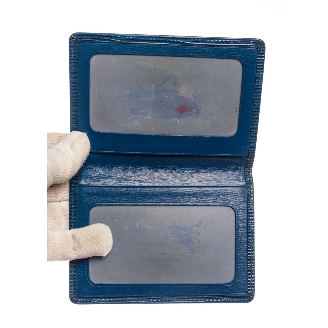Blue Epi leather Louis Vuitton ID holder with tonal leather interior, dual ID slots at interior walls and fold-over flap closure.