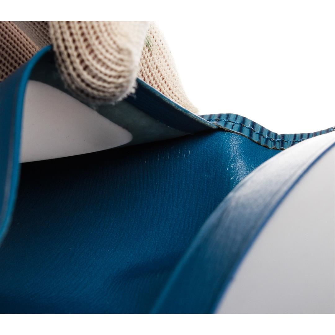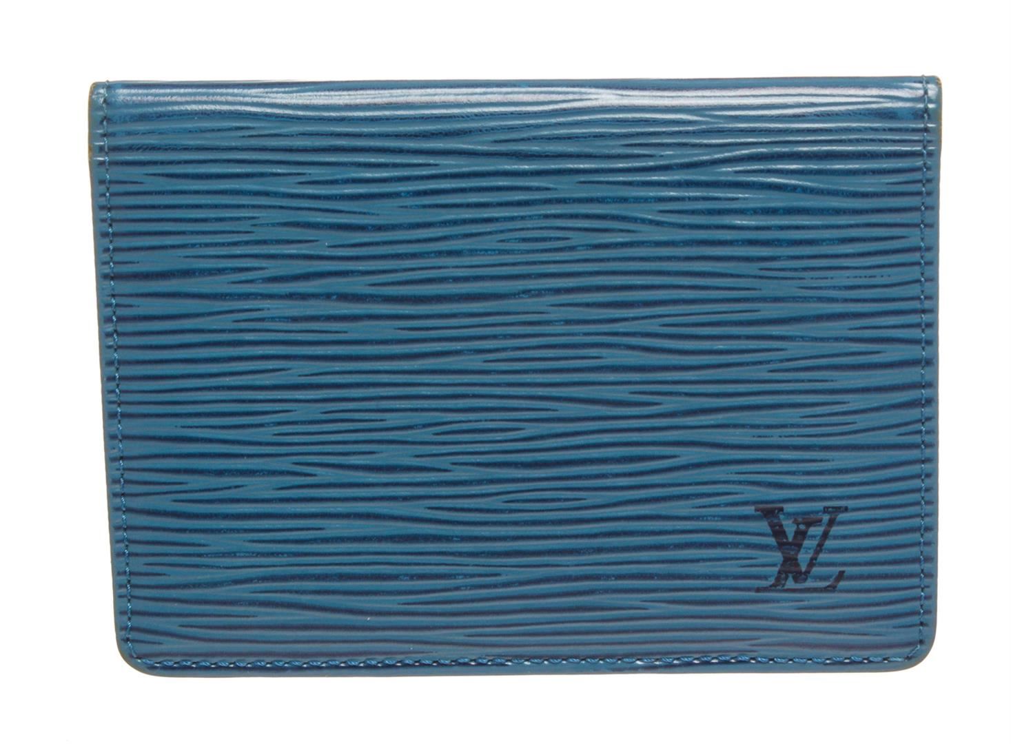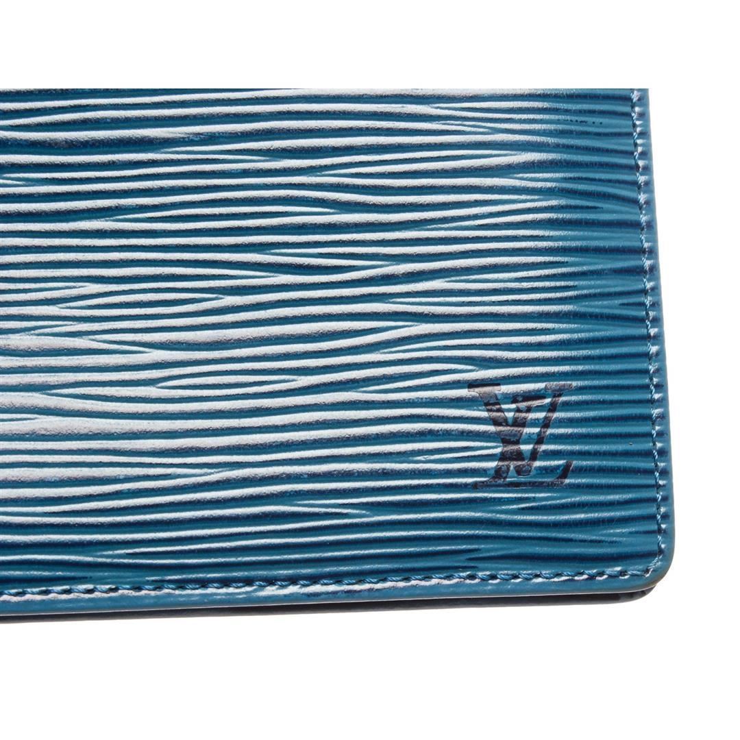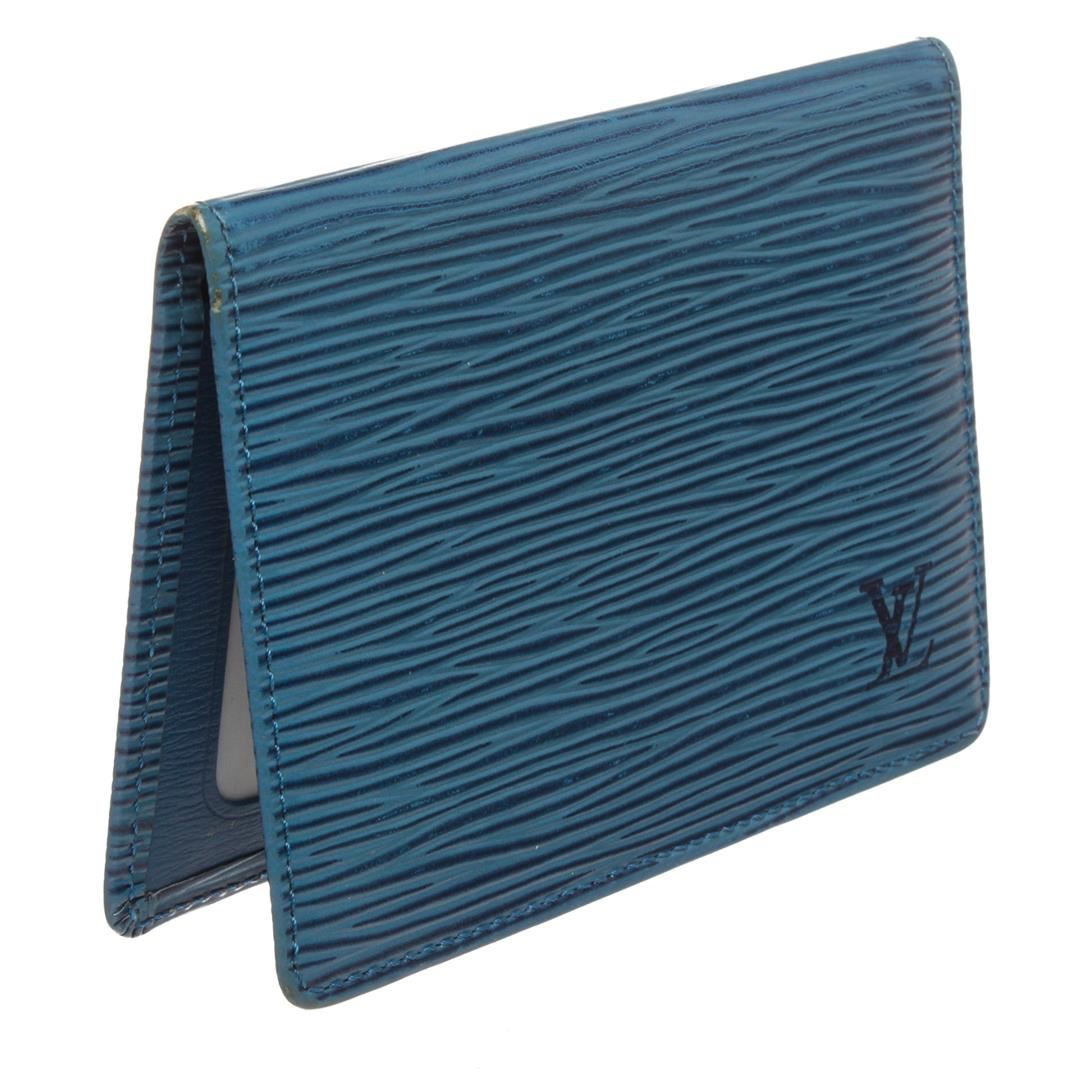 Blue Epi leather Louis Vuitton ID holder with leather interior, dual ID slots at interior walls and fold-over flap closure. Authentic.