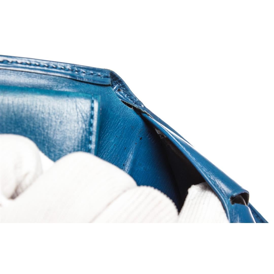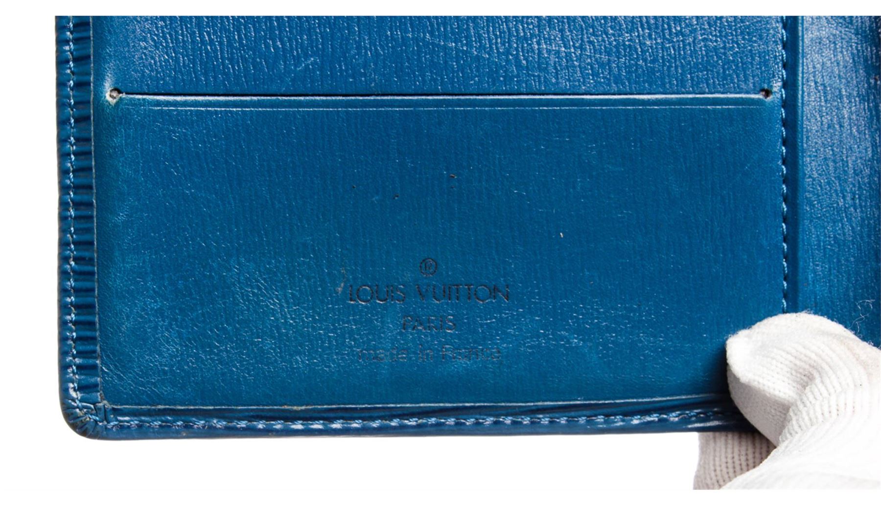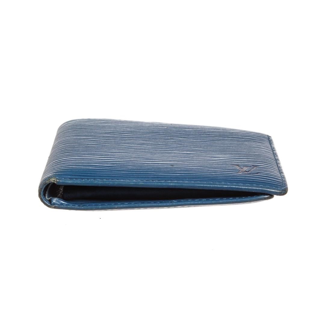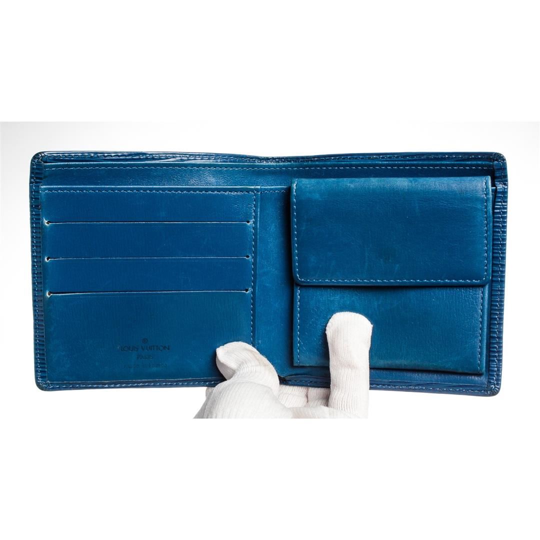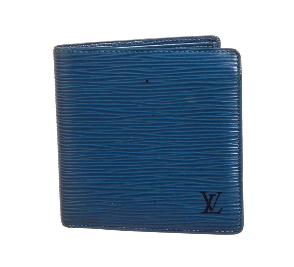 Blue epi leather Louis Vuitton Marco wallet with embossed logo at front, tonal cross grain leather lining, three card slots, dual pockets at interior walls; one with snap closure, dual bill compartments and bifold closure.