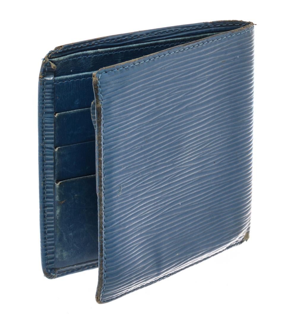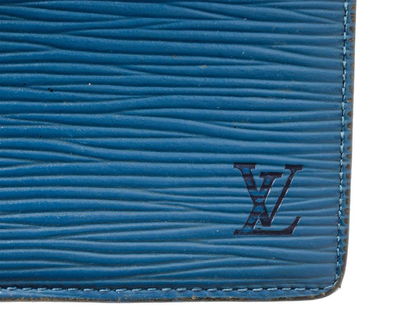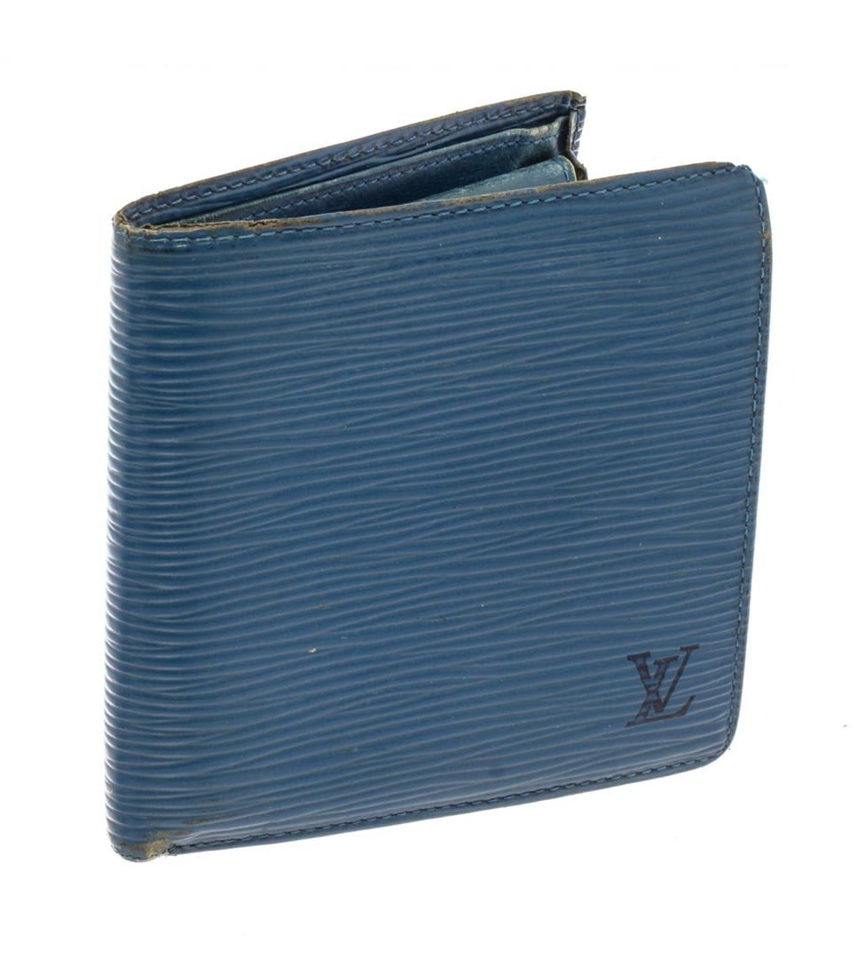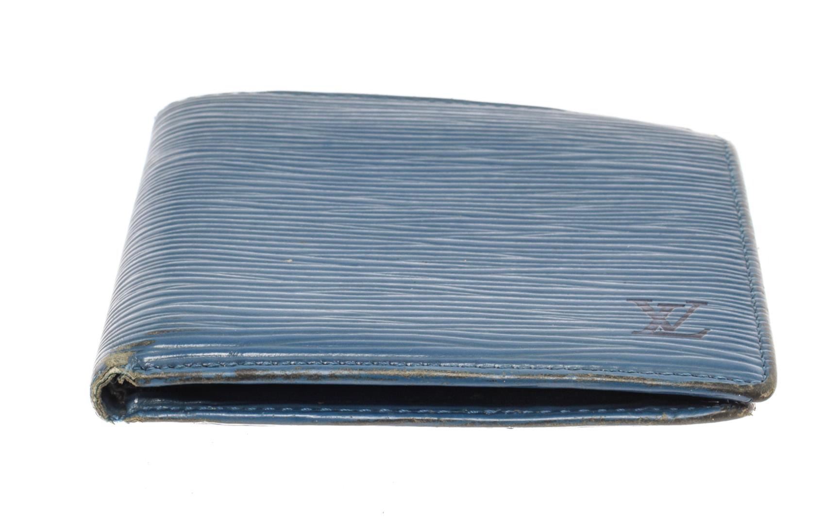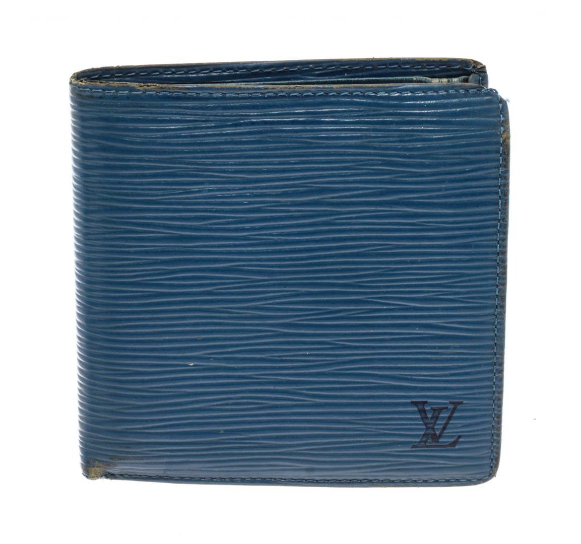 Louis Vuitton Blue Epi Leather Marco Bifold Wallet. All available information is listed in the description and shown in the photos. Louis Vuitton Blue Epi Leather Marco Bifold Wallet with epi leather, leather lining, four card slots, coin pouch and dual cash slots at interior, flap closure. Height: 4" Width: 4.5" Depth: 0.5", / 10.16 x 11.43 x 1.27 Cm