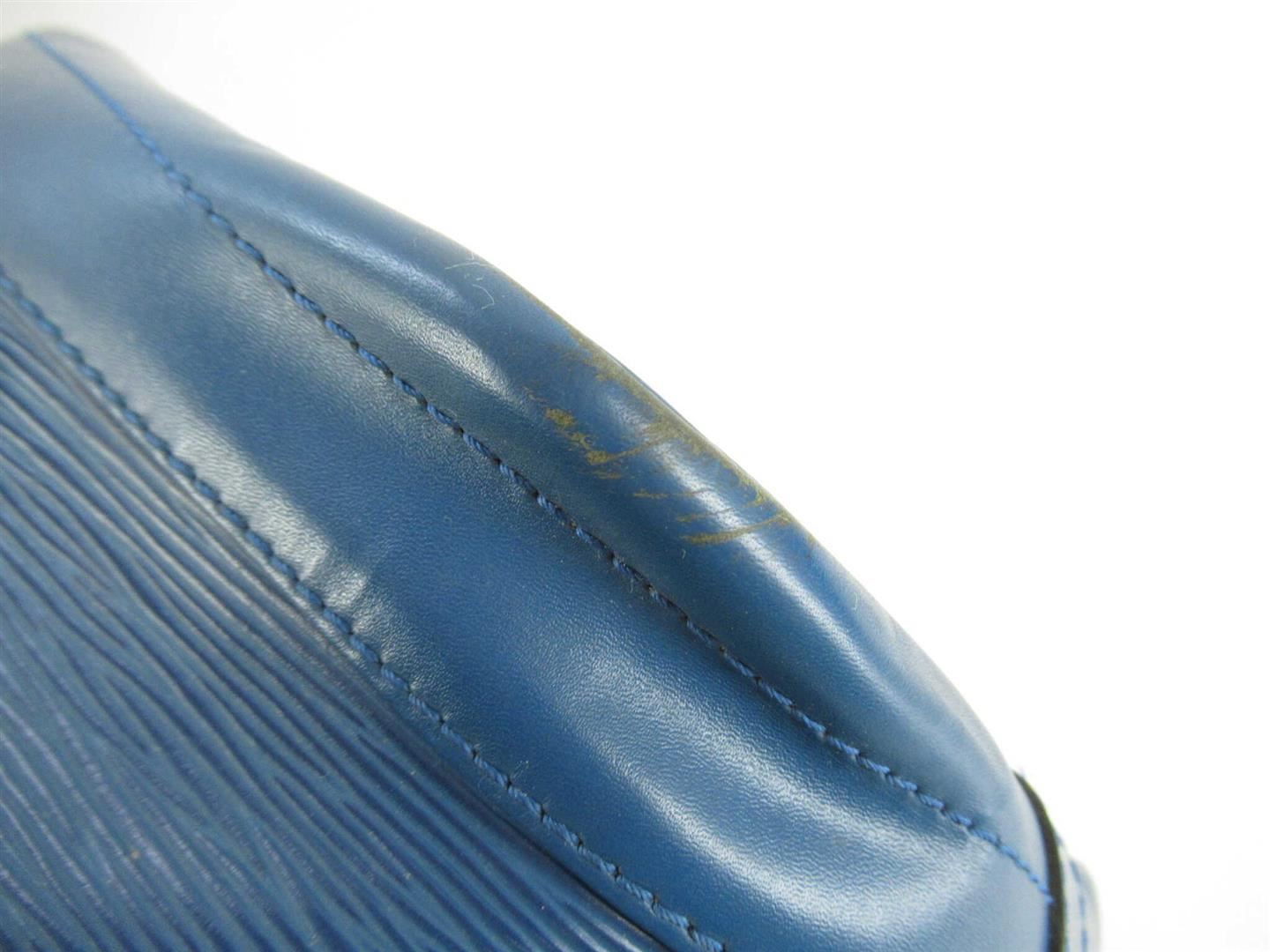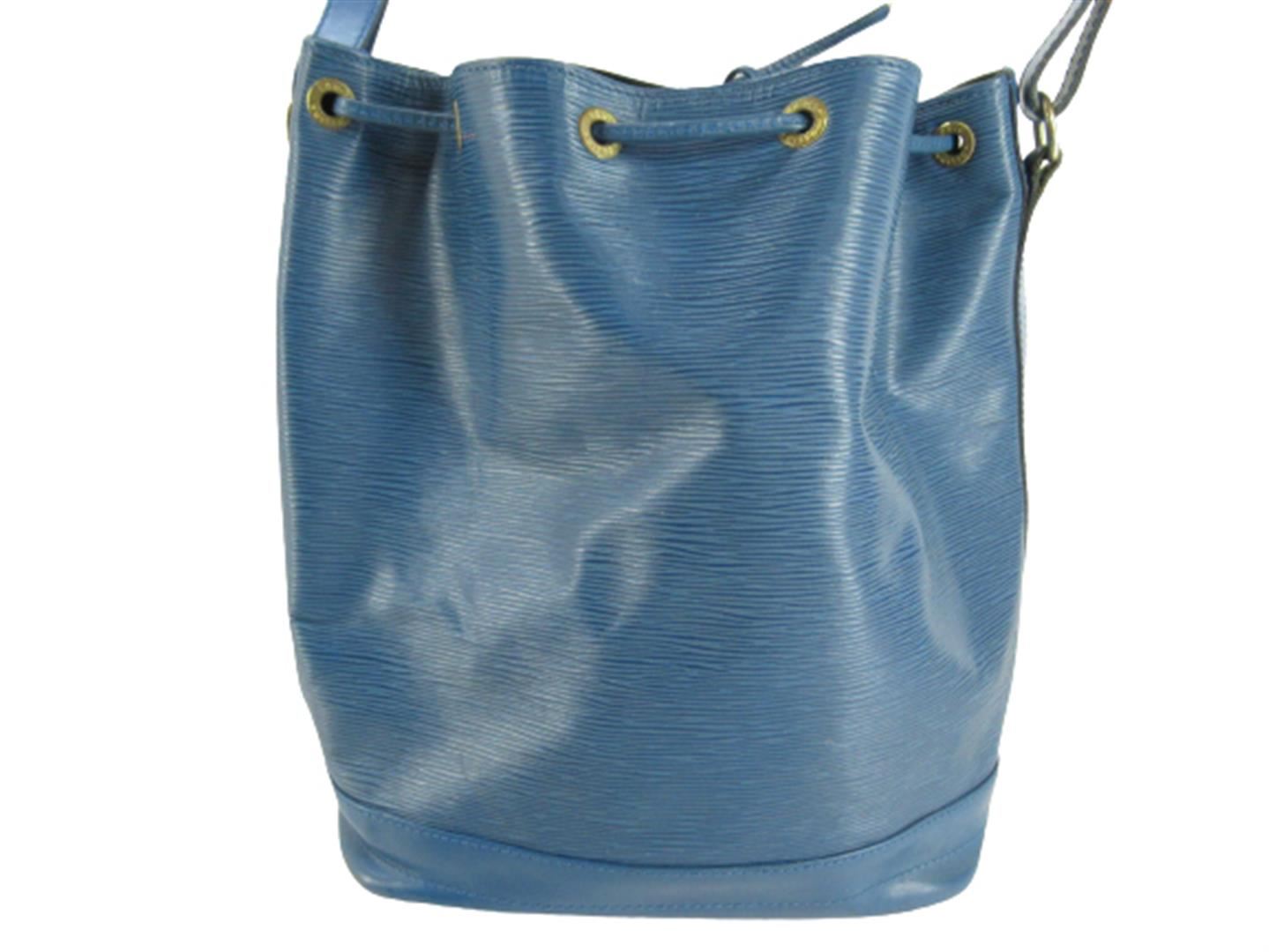 Blue Epi leather Louis Vuitton Noe bucket bag with gold-tone hardware, single shoulder strap, black suede lining and drawstring closure at front. Height: 12.5" Width: 14" Depth: 7"