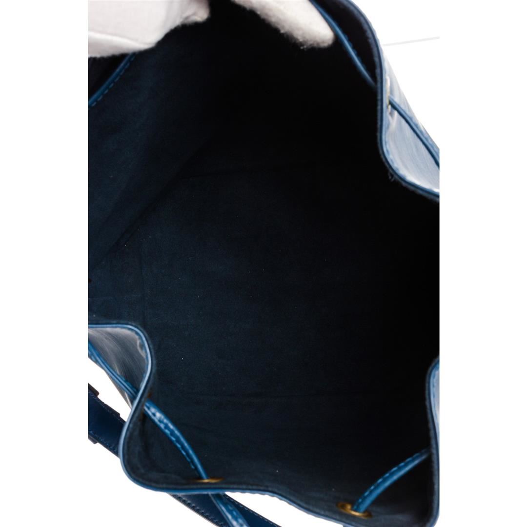 Blue Epi leather Louis Vuitton Noe GM with brass hardware, single adjustable shoulder strap, tonal leather trim, embossed logo at exterior side, Alcantara lining and drawstring closure at top.