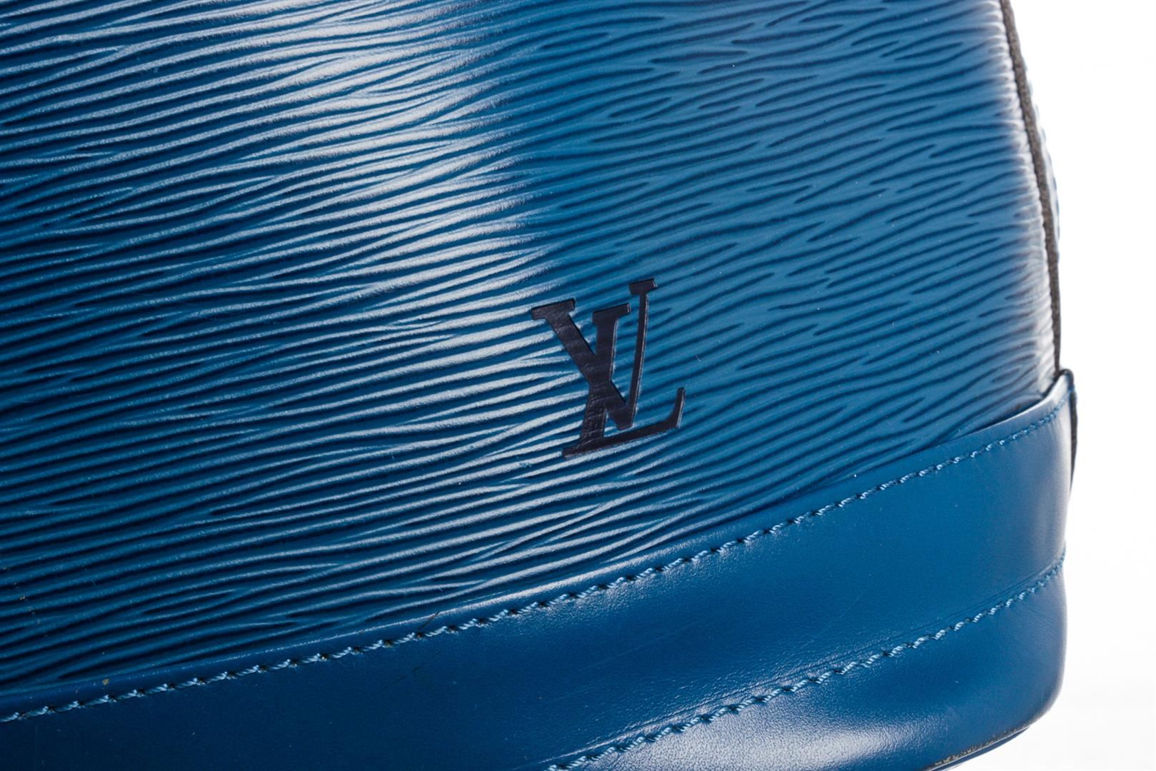 Blue Epi leather Louis Vuitton Noe GM with brass hardware, single adjustable shoulder strap, tonal leather trim, embossed logo at exterior side, Alcantara lining and drawstring closure at top.