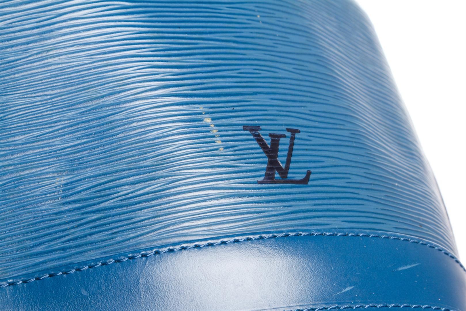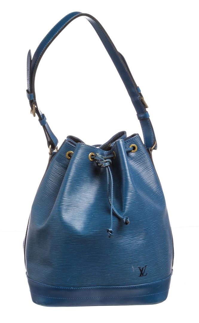 One Louis Vuitton Blue Epi Leather Noe GM Drawstring Shoulder Bag. Epi leather Louis Vuitton Noe GM with brass hardware, single adjustable shoulder strap, tonal leather trim, embossed logo at exterior side, Alcantara lining and drawstring closure at top.