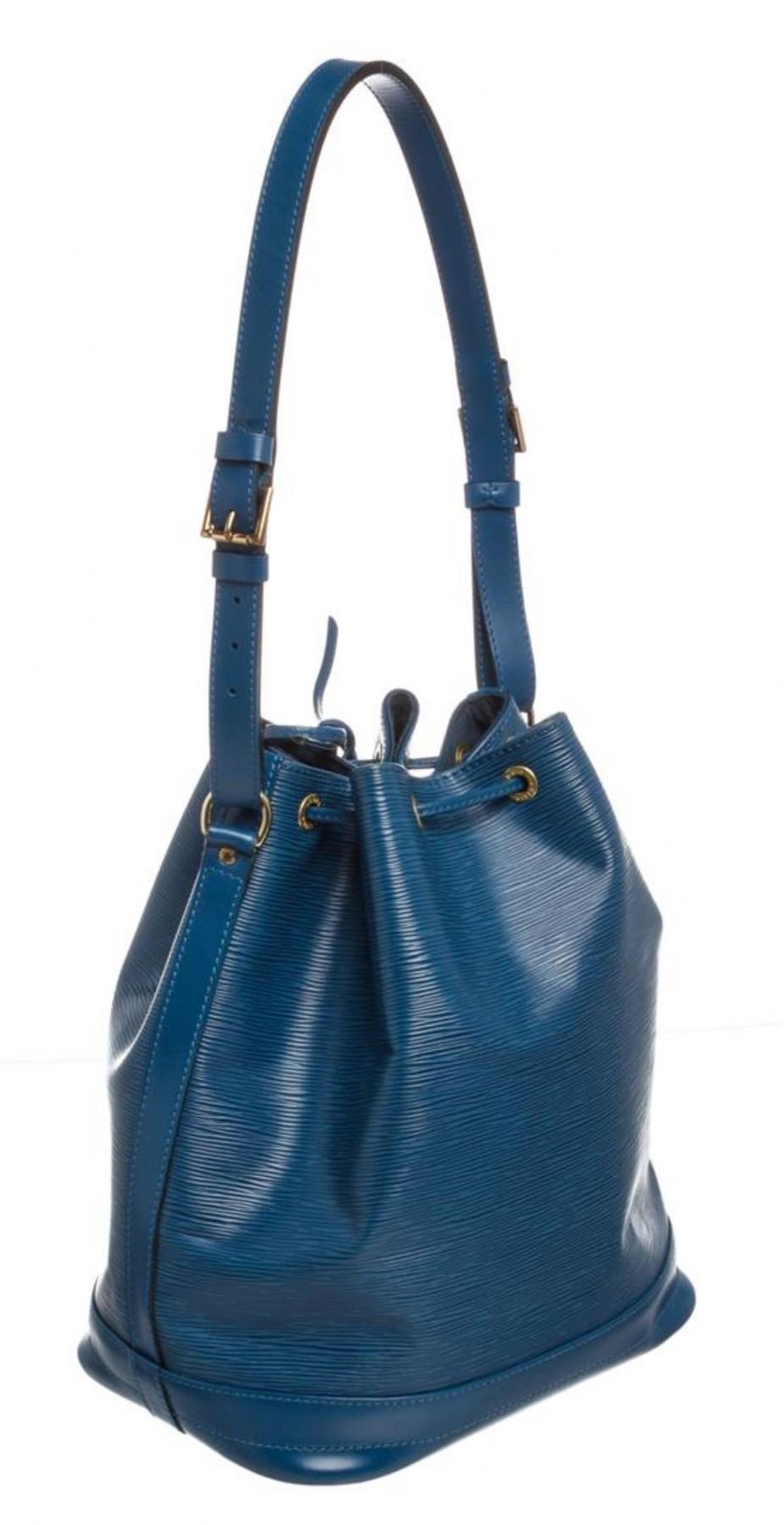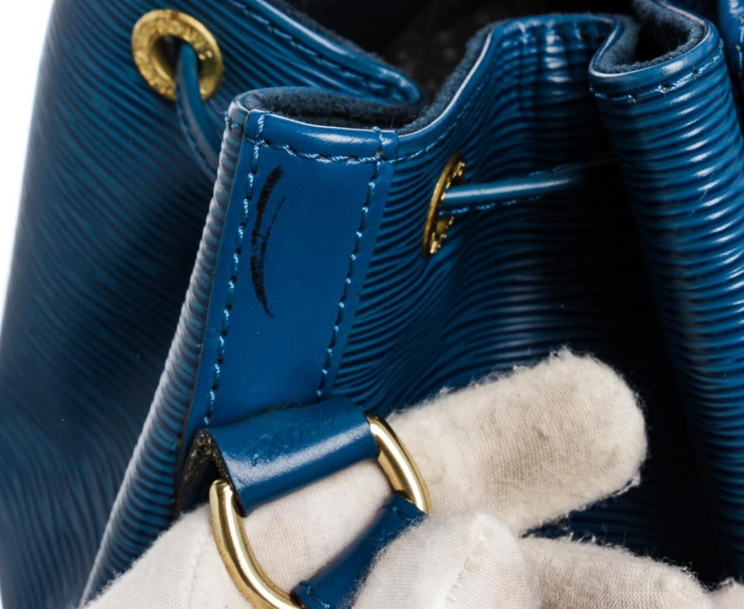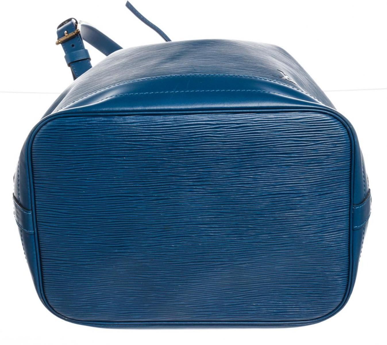 One Louis Vuitton Blue Epi Leather Noe GM Drawstring Shoulder Bag. Blue Epi leather Louis Vuitton Noe GM with brass hardware, single adjustable shoulder strap, tonal leather trim, embossed logo at exterior side, Alcantara lining and drawstring closure at top. MKX