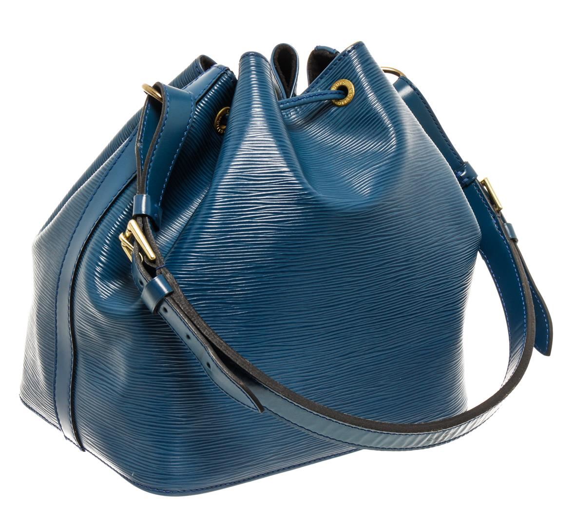 One Louis Vuitton Blue Epi Leather Noe PM. Item is sold AS-IS. All available information is listed in the description and shown in the photo. Louis Vuitton Blue Epi Leather Noe PM with adjustable shoulder strap, suede lining, gold tone hardware and drawstring closure.