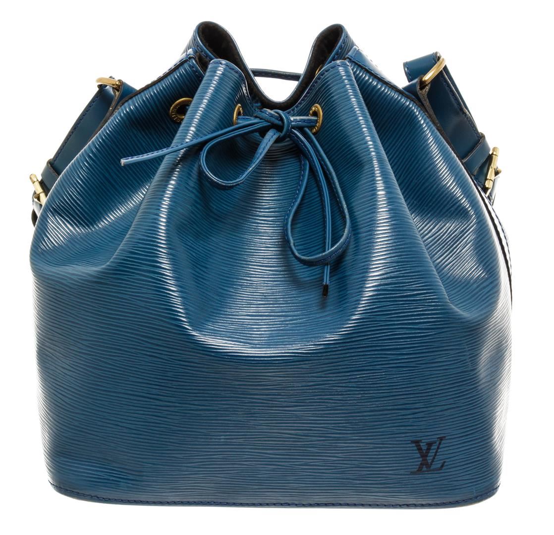 One Louis Vuitton Blue Epi Leather Noe PM. Item is sold AS-IS. All available information is listed in the description and shown in the photo. Louis Vuitton Blue Epi Leather Noe PM with adjustable shoulder strap, suede lining, gold tone hardware and drawstring closure.