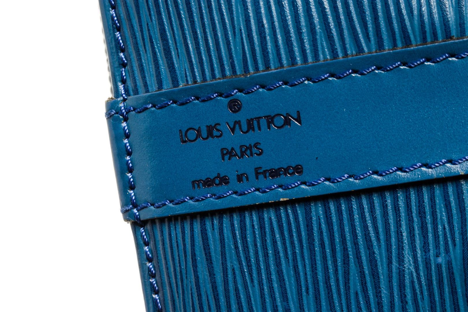 One Louis Vuitton Blue Epi Leather Noe PM. Item is sold AS-IS. All available information is listed in the description and shown in the photo. Louis Vuitton Blue Epi Leather Noe PM with adjustable shoulder strap, suede lining, gold tone hardware and drawstring closure.