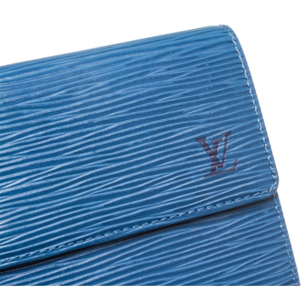 Blue leather Sarah wallet. Overall flap snap button closure. Interior contains two open compartments, 2ip pockets at underside flap closure and large zipper partition compartment.