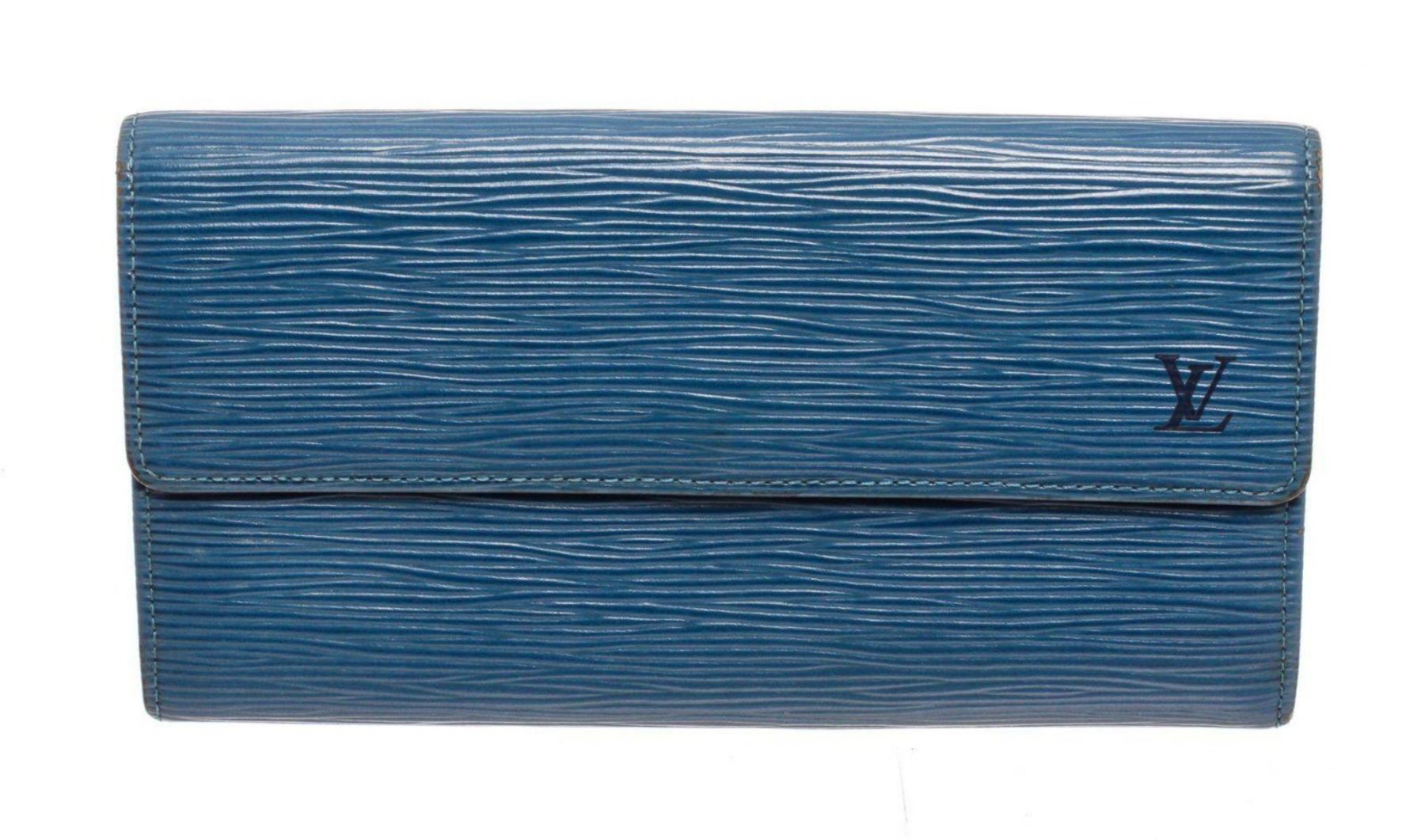 Louis Vuitton Blue Epi Leather Sarah Wallet. Louis Vuitton Blue Epi Leather Sarah Wallet with material epi leather, gold-tone hardware, three interior compartments pockets, trim tan vachetta leather and snap closure. MEASUREMENTS: Length 4.25 in / 11