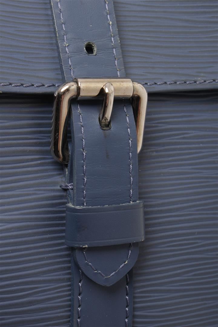 One Louis Vuitton Blue Epi Leather Segur MM Shoulder Bag. Item is sold AS-IS. All available information is listed in the description and shown in the photo. Louis Vuitton Blue Epi Leather Segur MM Shoulder Bag with silver-tone hardware, epi leather in deep earth blue, smooth and tall leather strap top handles with silver buckles and a cross-over flap with a silver press-lock. Length: 15.00 in, Width: 5.00 in, Height: 10.00 in / 38.1 x 12.7 x 25.4 cm