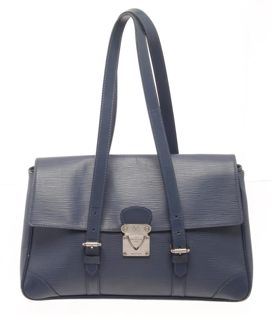 One Louis Vuitton Blue Epi Leather Segur MM Shoulder Bag. Item is sold AS-IS. All available information is listed in the description and shown in the photo. Louis Vuitton Blue Epi Leather Segur MM Shoulder Bag with silver-tone hardware, epi leather in deep earth blue, smooth and tall leather strap top handles with silver buckles and a cross-over flap with a silver press-lock. Length: 15.00 in, Width: 5.00 in, Height: 10.00 in / 38.1 x 12.7 x 25.4 cm