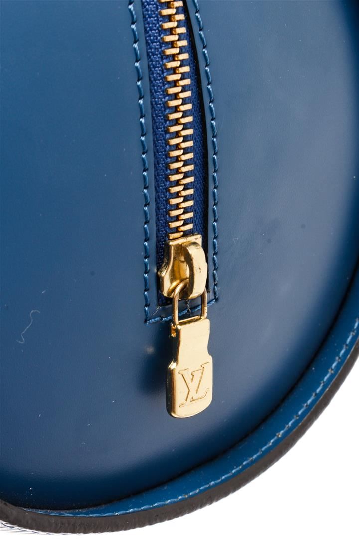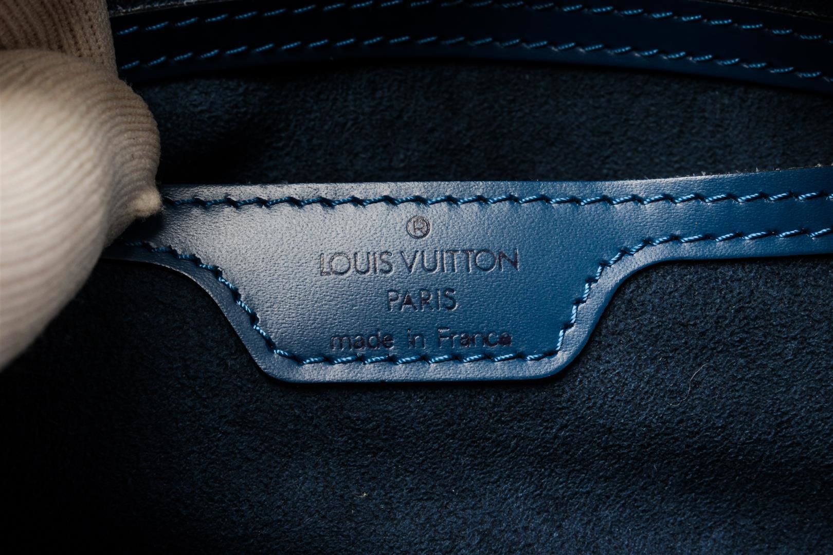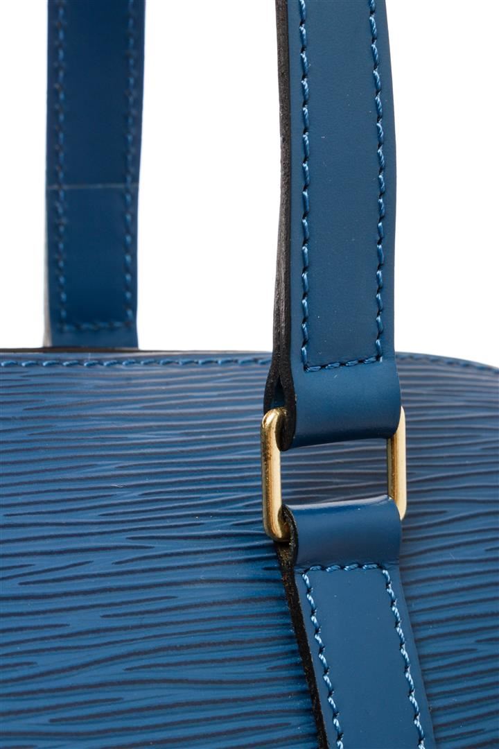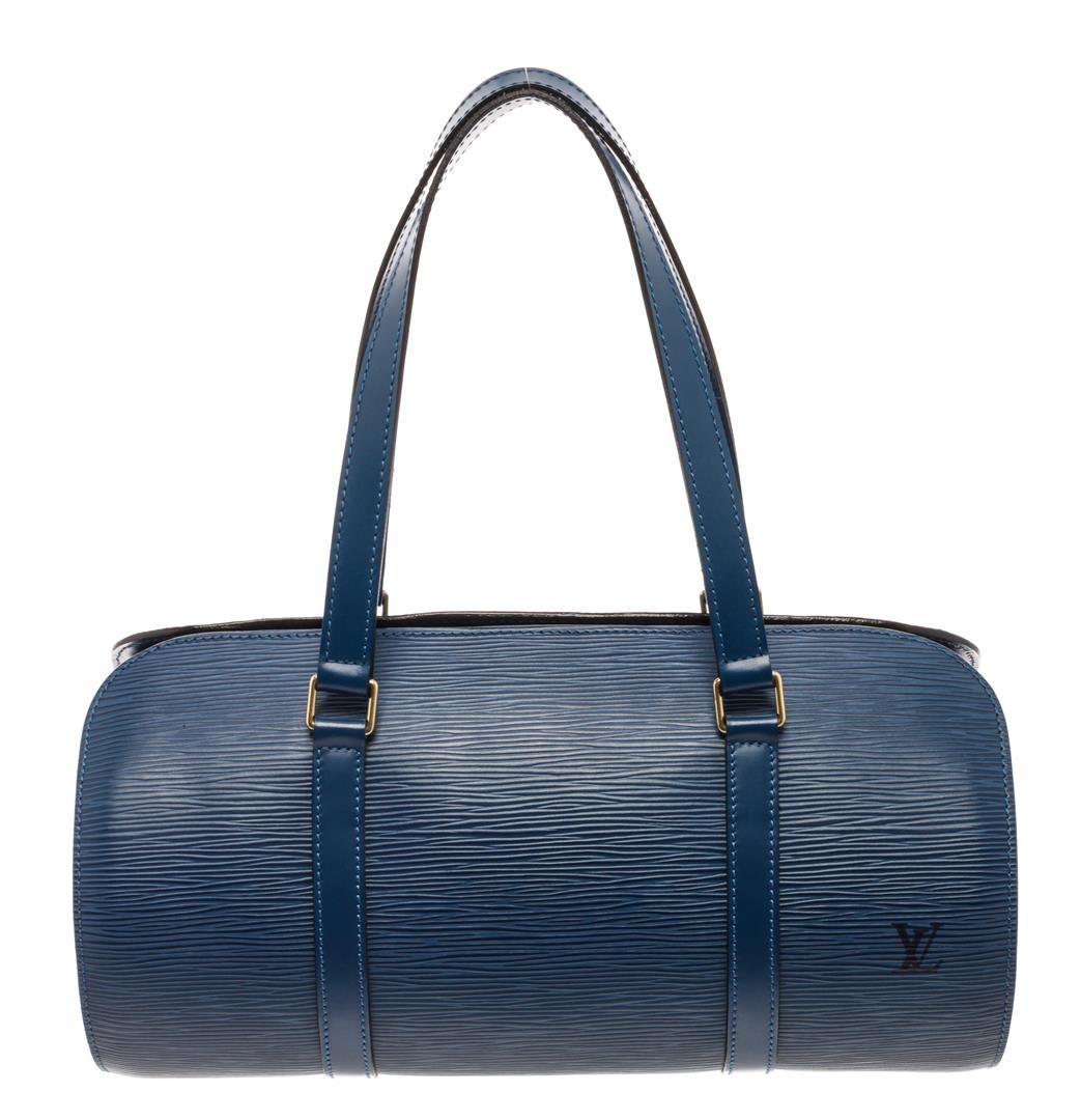 Louis Vuitton Blue Epi Leather Soufflot Shoulder Bag. All available information is listed in the description and shown in the photos. Louis Vuitton Blue Epi Leather Soufflot Shoulder Bag with flat leather straps, gold-tone brass hardware, dual shoulder straps, suede lining & single interior pocket, top zipper closure. Height: 11.75" Width: 12.75" Depth: 6", Shoulder Strap Drop: 7.75" / 29.84 x 32.38 x 15.24 Cm