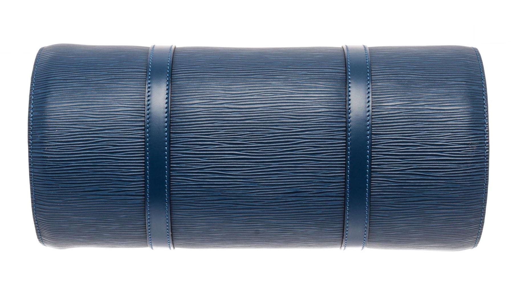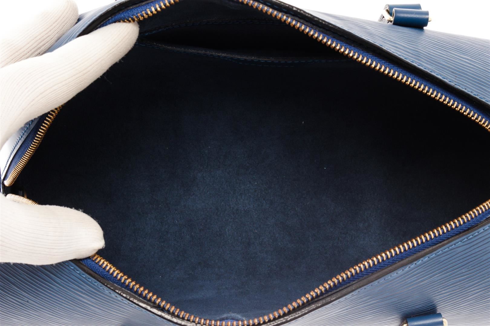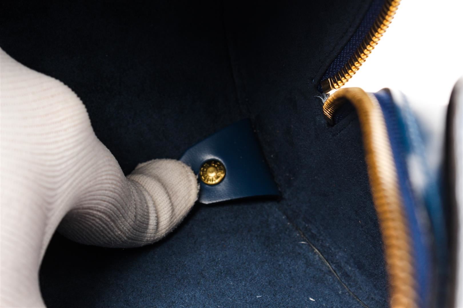 Louis Vuitton Blue Epi Leather Soufflot Shoulder Bag. All available information is listed in the description and shown in the photos. Louis Vuitton Blue Epi Leather Soufflot Shoulder Bag with flat leather straps, gold-tone brass hardware, dual shoulder straps, suede lining & single interior pocket, top zipper closure. Height: 11.75" Width: 12.75" Depth: 6", Shoulder Strap Drop: 7.75" / 29.84 x 32.38 x 15.24 Cm