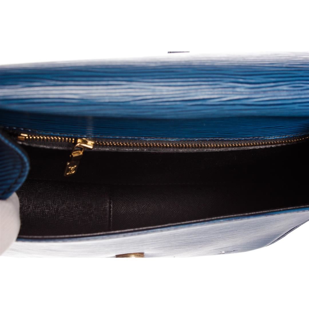 Blue Epi leather Louis Vuitton St. Cloud GM bag with brass hardware, single adjustable shoulder strap, embossed logo accent at front face, single slit pocket at back exterior, Taiga leather interior, single zipper pocket at interior wall and snap closure at front flap.