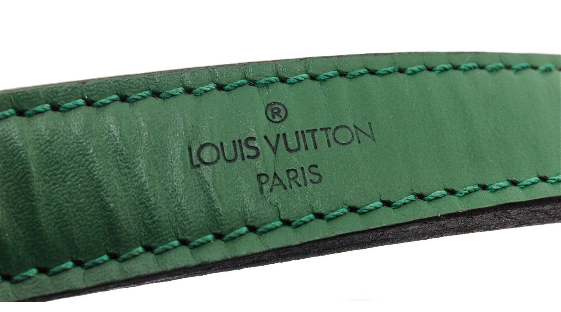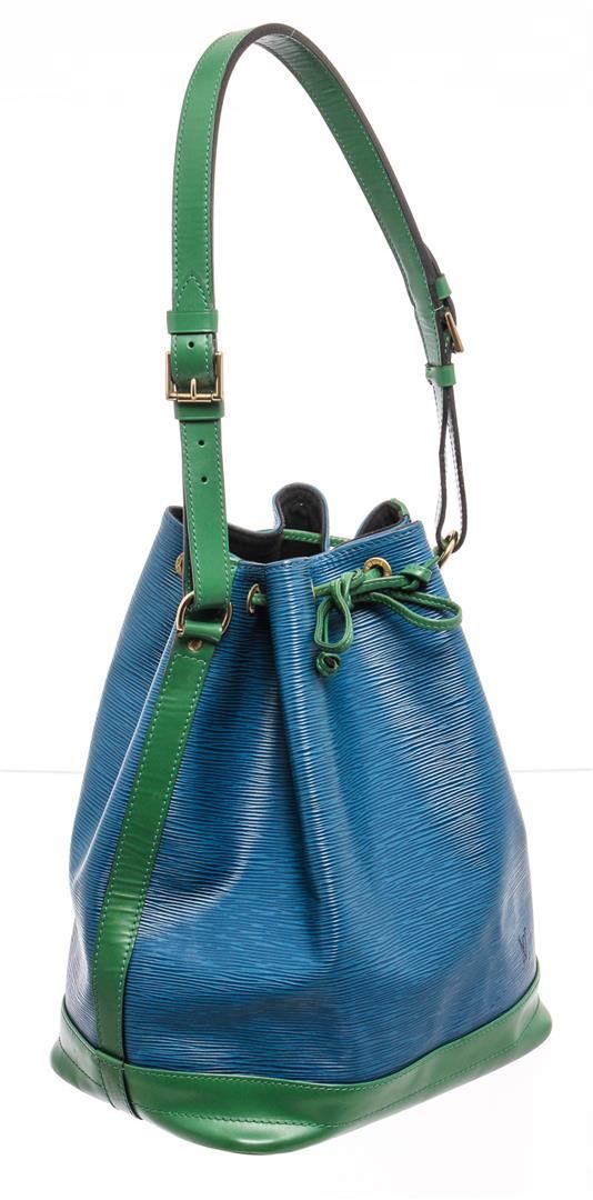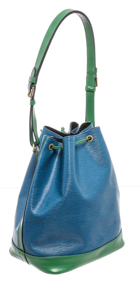 Blue and Green Epi leather Louis Vuitton Noe PM with brass hardware, adjustable flat shoulder strap, tonal Alcantara lining and drawstring closure at top.