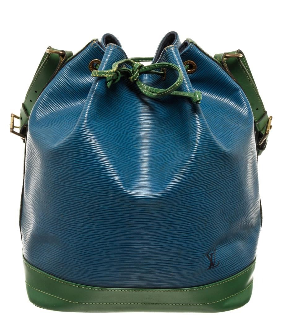 One Louis Vuitton Blue & Green Epi Leather PM. Item is sold AS-IS. All available information is listed in the description and shown in the photo. Louis Vuitton Blue & Green Epi Leather PM with suede lining, adjustable strap, gold tone hardware and drawstring closure