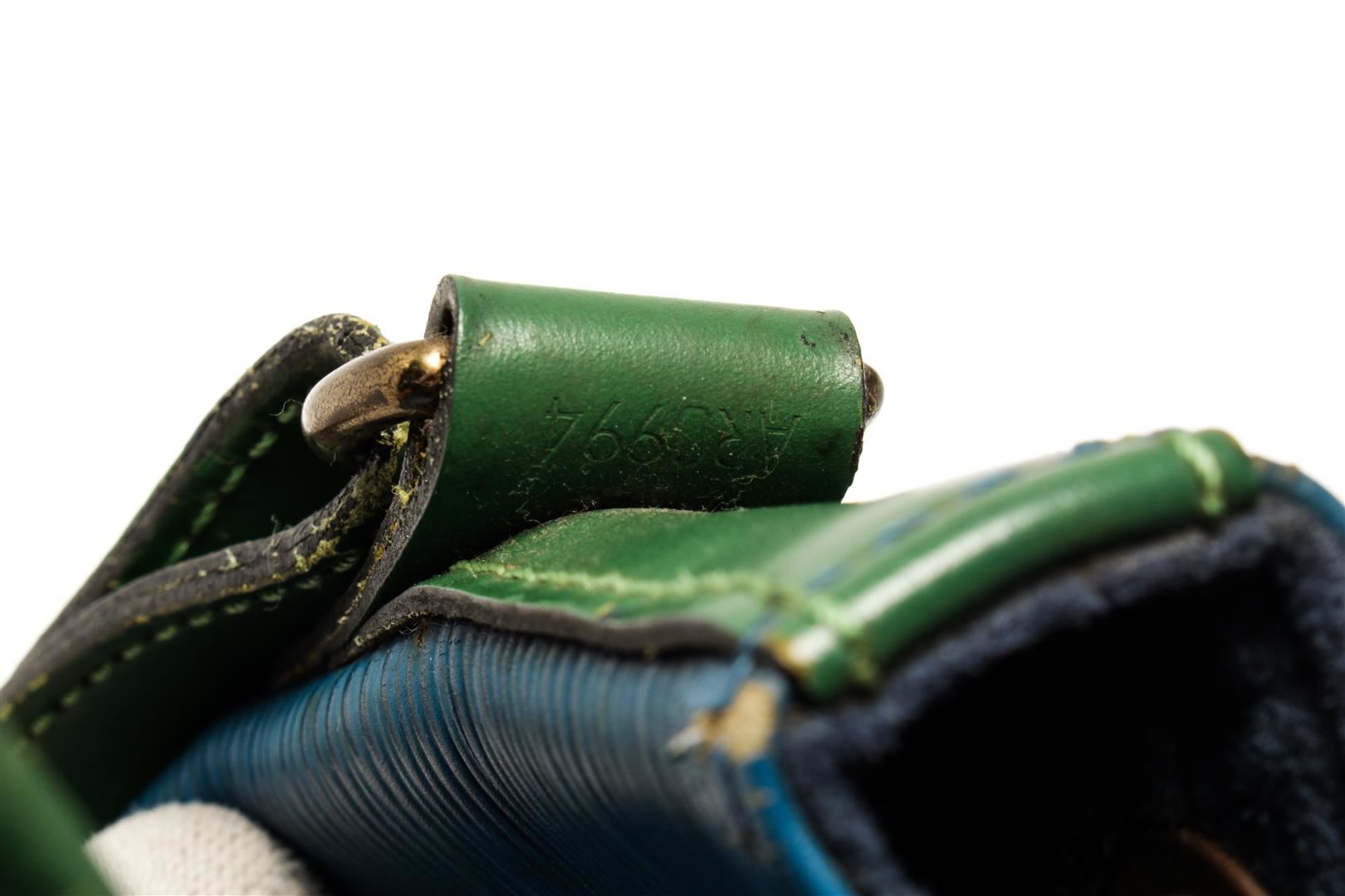 One Louis Vuitton Blue & Green Epi Leather PM. Item is sold AS-IS. All available information is listed in the description and shown in the photo. Louis Vuitton Blue & Green Epi Leather PM with suede lining, adjustable strap, gold tone hardware and drawstring closure