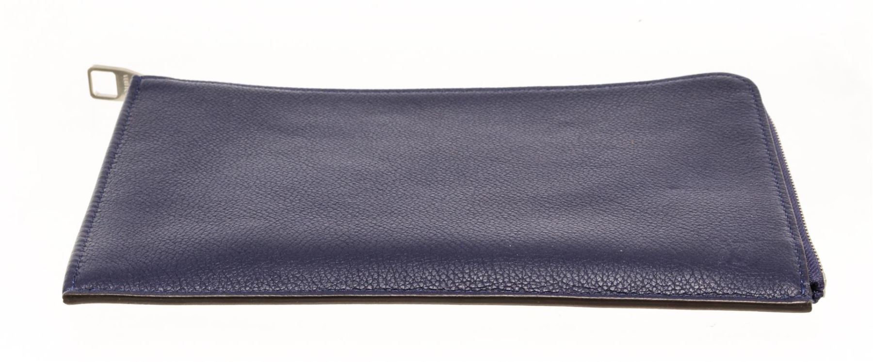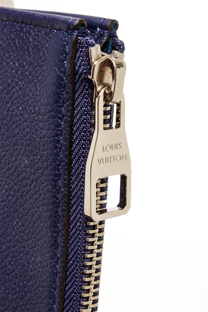 One Louis Vuitton Blue Leather Pochette Jules PM. Item is sold AS-IS. All available information is listed in the description and shown in the photo. Louis Vuitton blue leather Pochette Jules GM with embossed logo on the exterior, blue suede lining, silver-toned hardware, zipper closure, and one compartment with one slip pocket.