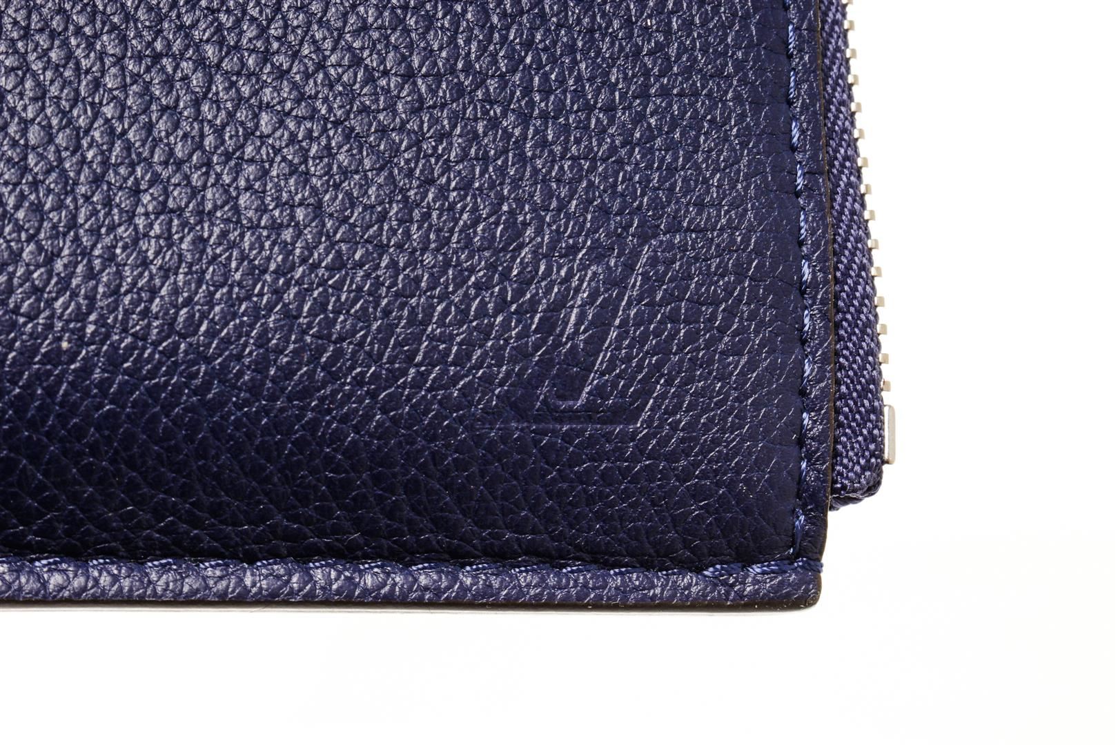 One Louis Vuitton Blue Leather Pochette Jules PM. Item is sold AS-IS. All available information is listed in the description and shown in the photo. Louis Vuitton blue leather Pochette Jules GM with embossed logo on the exterior, blue suede lining, silver-toned hardware, zipper closure, and one compartment with one slip pocket.