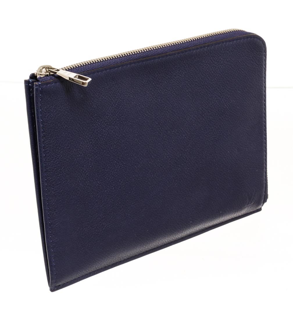 One Louis Vuitton Blue Leather Pochette Jules PM. Item is sold AS-IS. All available information is listed in the description and shown in the photo. Louis Vuitton blue leather Pochette Jules GM with embossed logo on the exterior, blue suede lining, silver-toned hardware, zipper closure, and one compartment with one slip pocket.
