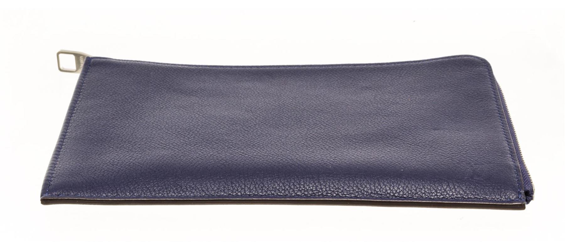 One Louis Vuitton Blue Leather Pochette Jules PM. Item is sold AS-IS. All available information is listed in the description and shown in the photo. Louis Vuitton blue leather Pochette Jules GM with embossed logo on the exterior, blue suede lining, silver-toned hardware, zipper closure, and one compartment with one slip pocket.