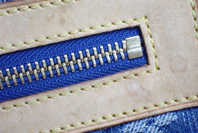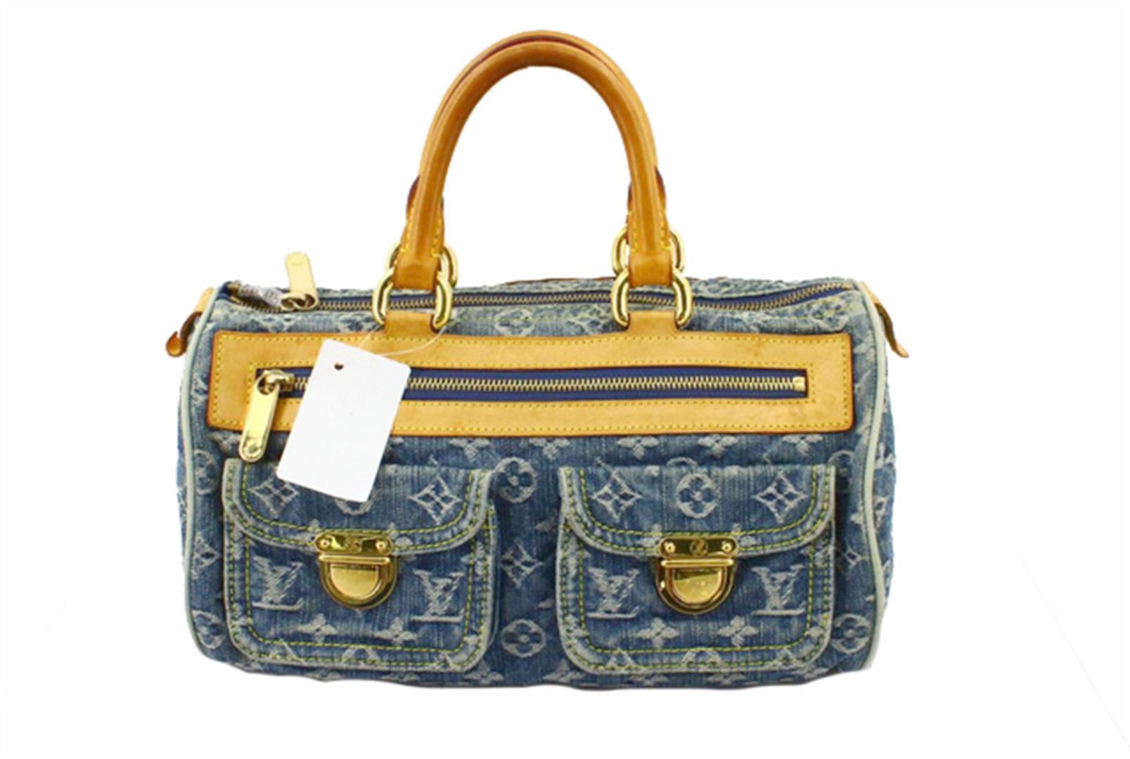 Blue Monogram denim of Louis Vuitton Neo Speedy satchel bag features gold-tone hardware, dual rolled handles, tan leather trim embellishment & dual exterior pockets, marigold Alcantara lining & single interior pocket, and zip closure at side. Height: 9