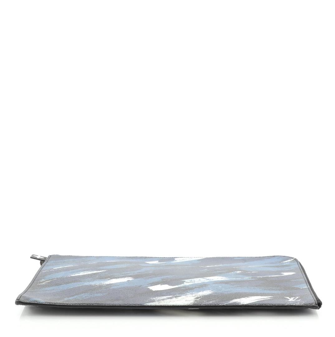 One Louis Vuitton Blue Multicolor Camo Printed Canvas Leather Pochette Jour Limited Edition GM Pouch. Item is sold AS-IS. All available information is listed in the description and shown in the photo. Louis Vuitton Blue Multicolor Camo Printed Canvas Leather Pochette Jour Limited Edition GM Pouch Condition Details: Wear and peeling on base and opening corners, light wear in interior, scratches on hardware. Measurements: Height 9.5", Width 13", Depth 2.5", Strap Drop -"