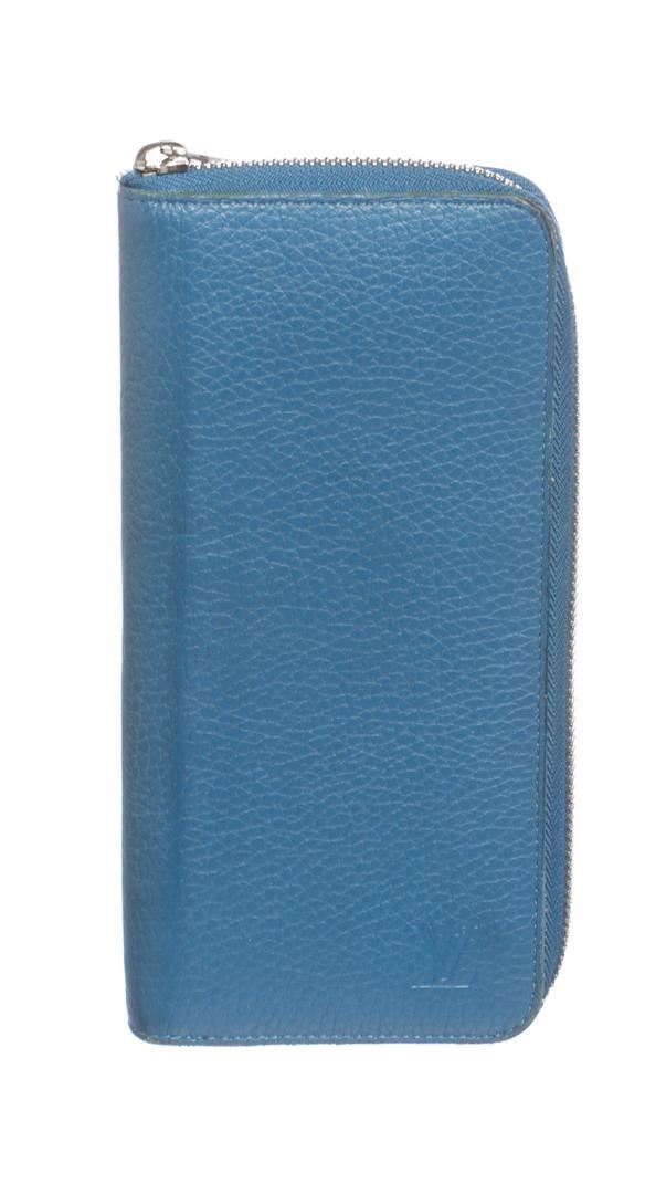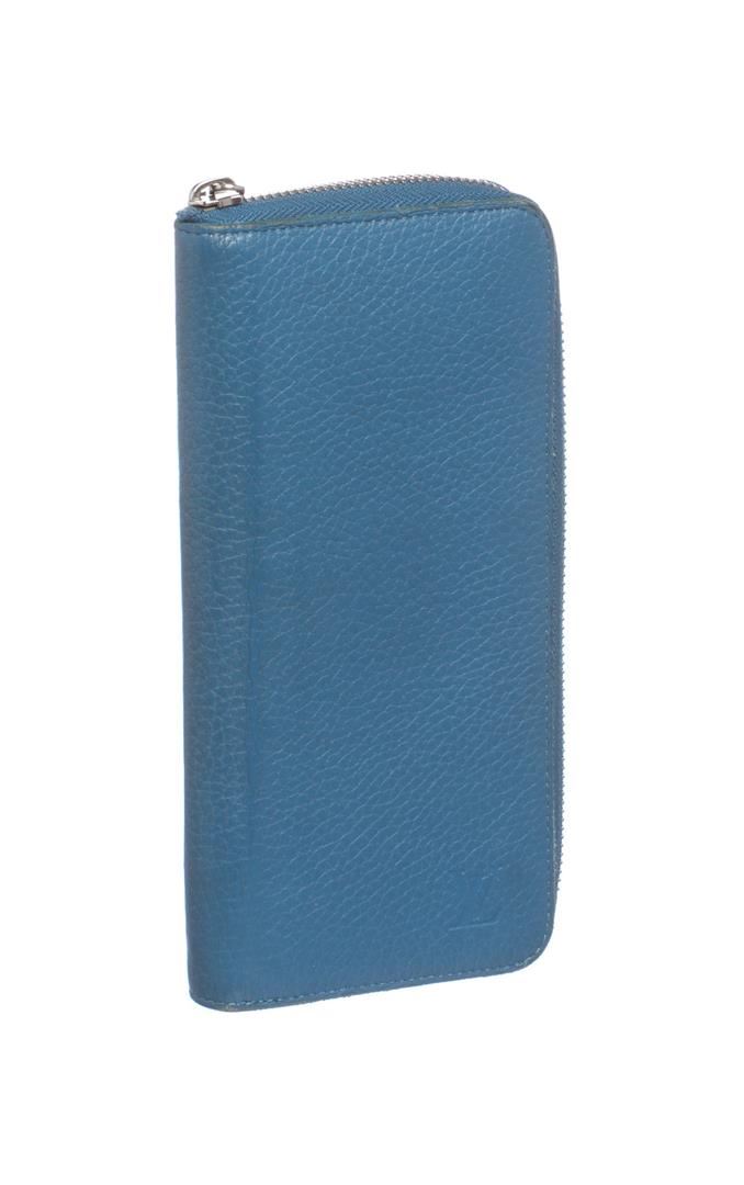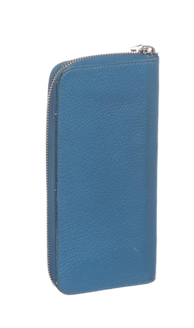Blue Taurillon leather Vertical Zippy Wallet with silver-tone hardware, tonal lining, three interior compartments; one with zip closure, 10 card slots and zip closure at side.