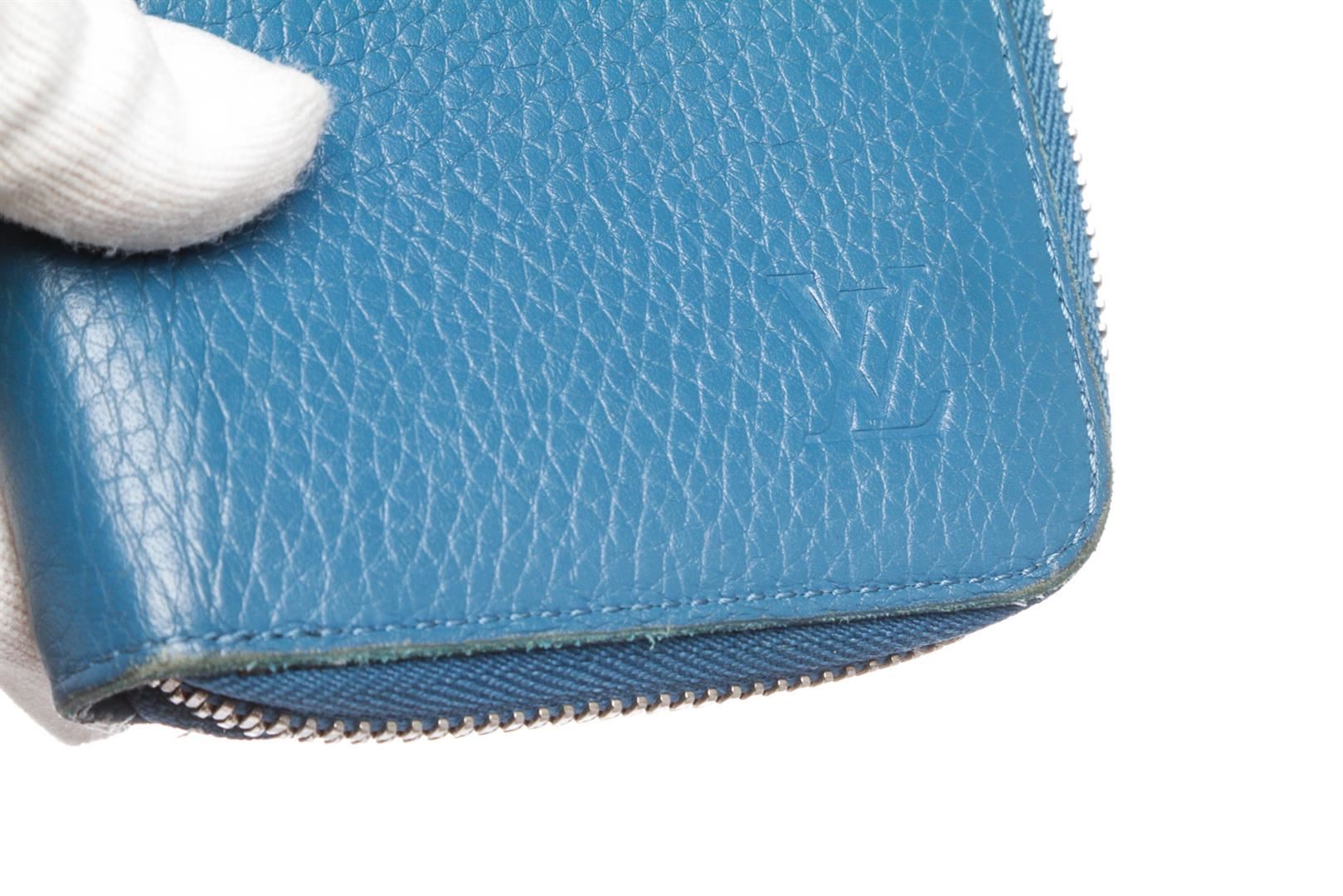 Blue Taurillon leather Vertical Zippy Wallet with silver-tone hardware, tonal lining, three interior compartments; one with zip closure, 10 card slots and zip closure at side.