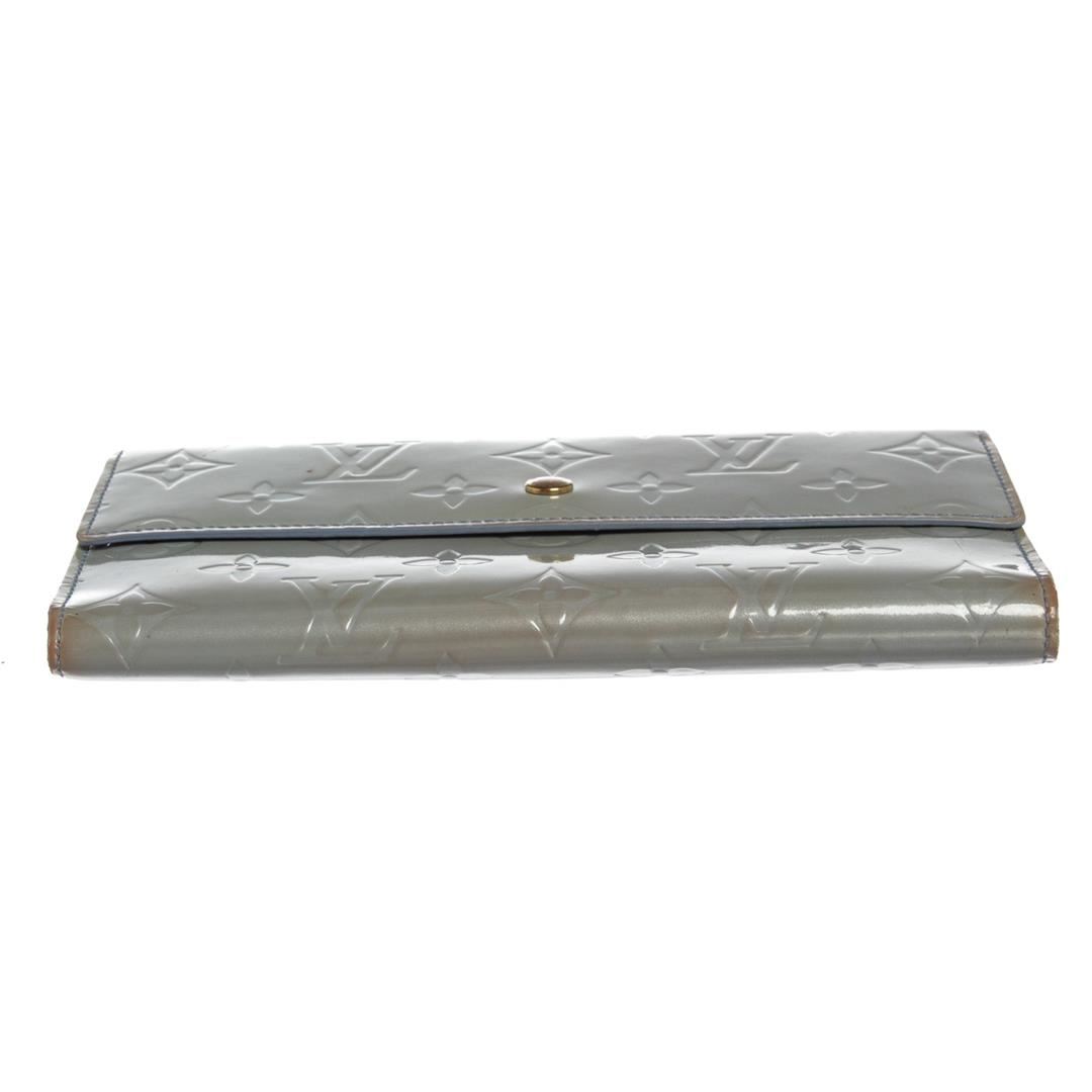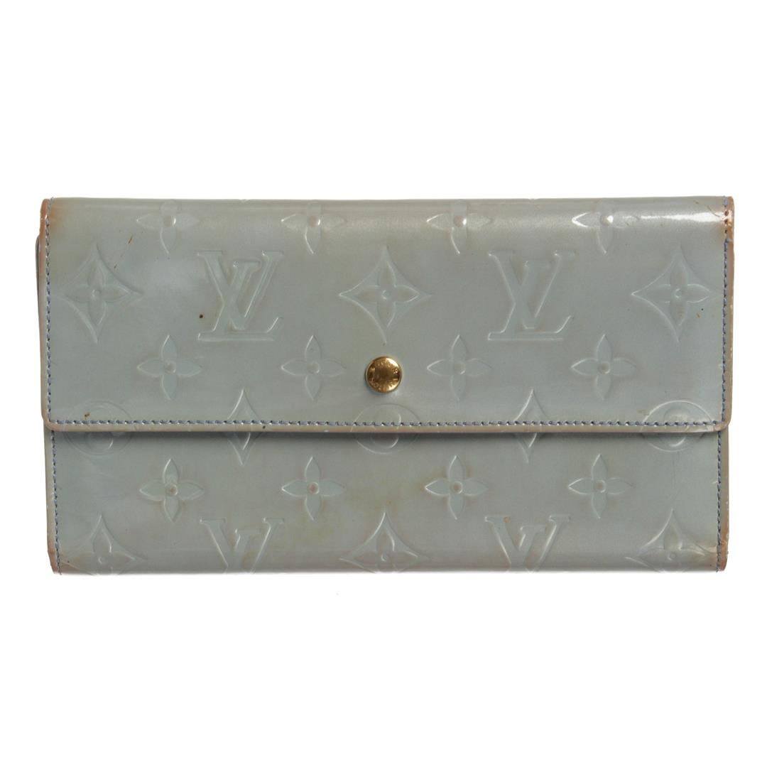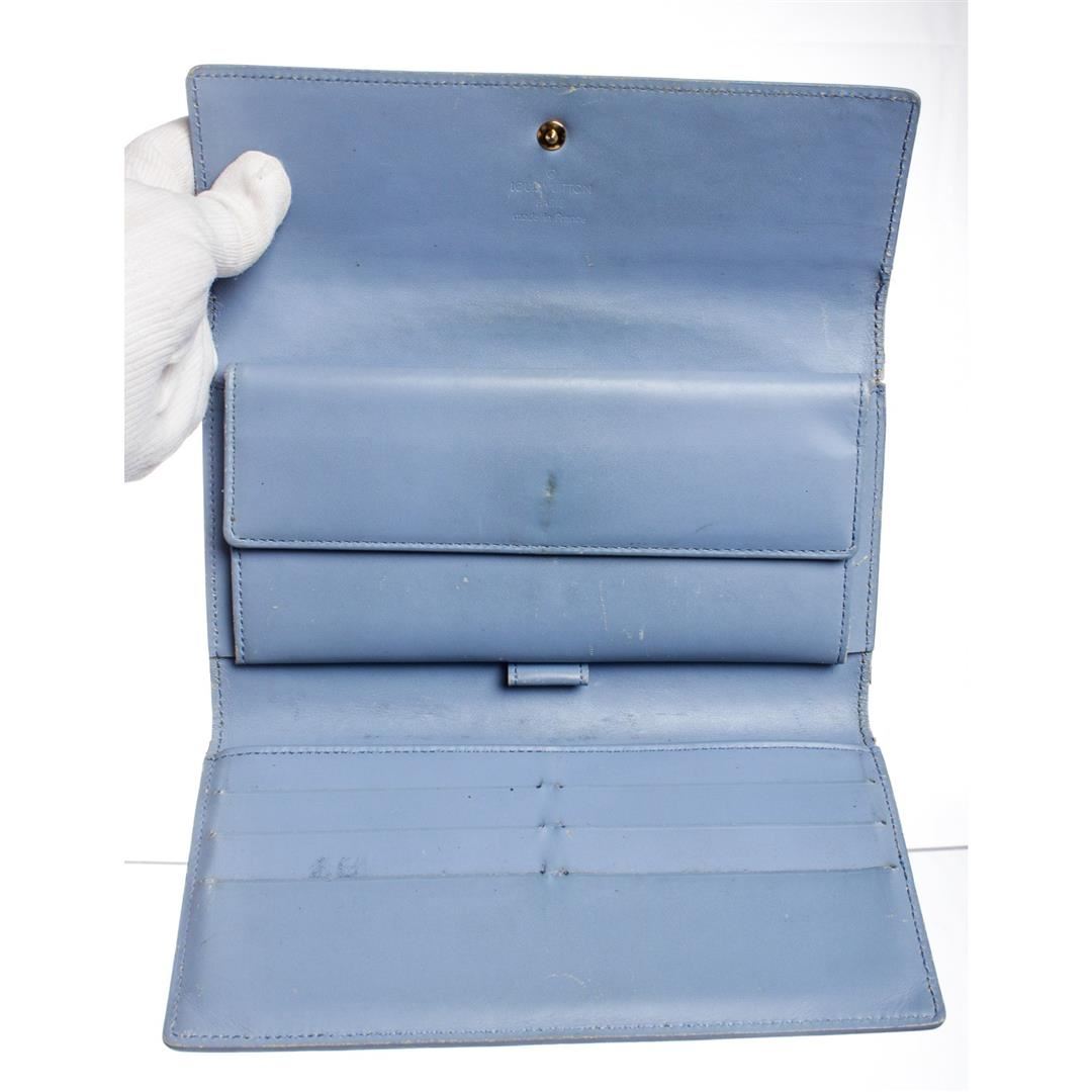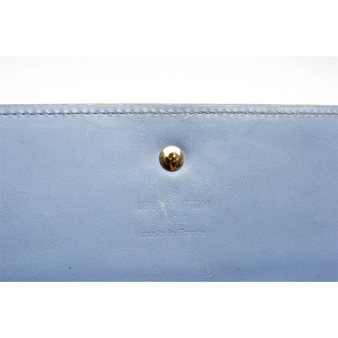 Louis Vuitton light blue Vernis monogram patent leather Porte Tresor International wallet with blue leather lining, gold-tone hardware, dual bill compartments, single interior pocket with snap closure, six card slots, single pen holder and snap closure at front flap. Please note, discoloration on edges and spots on back.