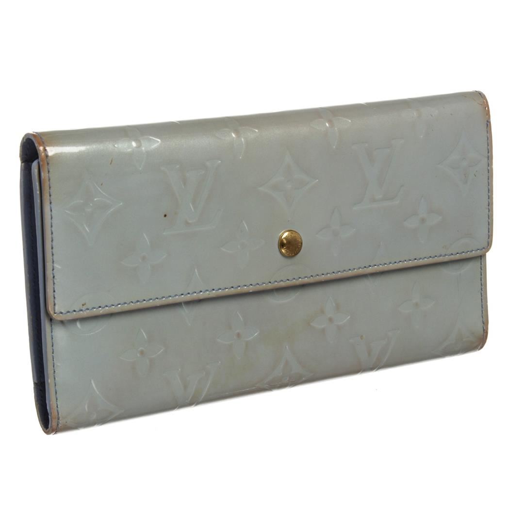 Louis Vuitton light blue Vernis monogram patent leather Porte Tresor International wallet with blue leather lining, gold-tone hardware, dual bill compartments, single interior pocket with snap closure, six card slots, single pen holder and snap closure at front flap. Please note, discoloration on edges and spots on back.